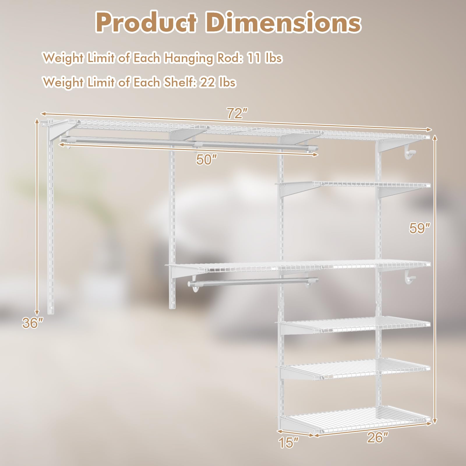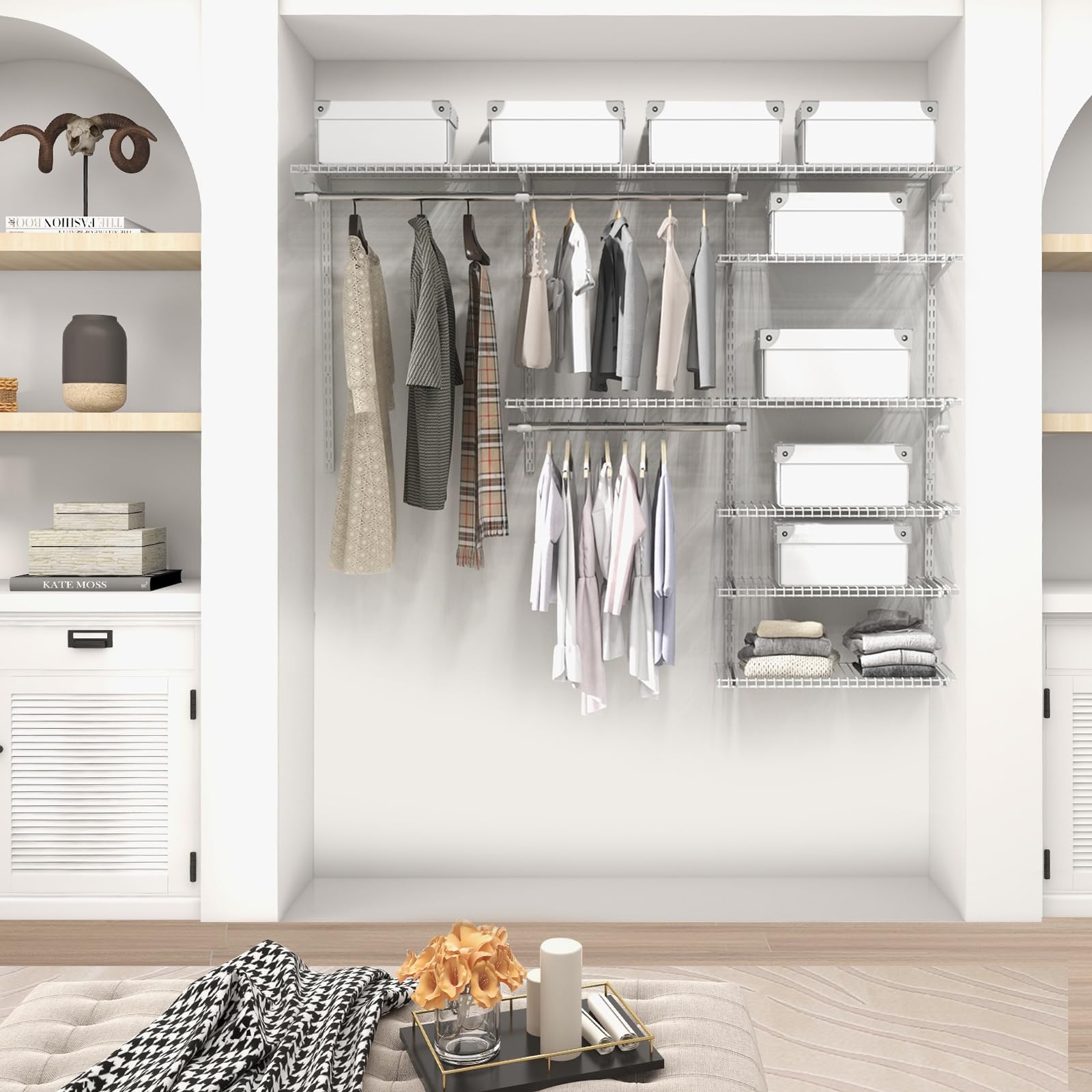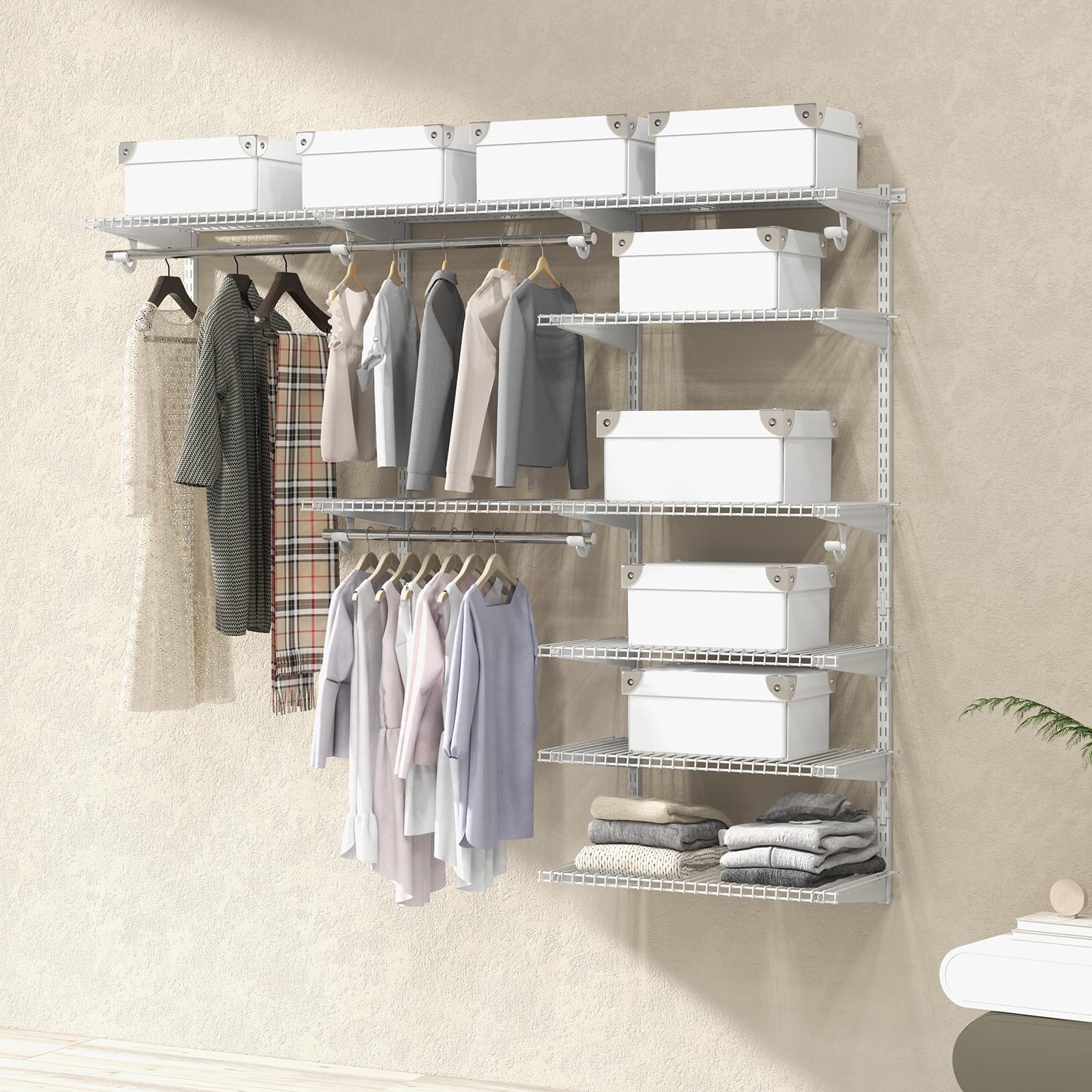 Make the most of your closet space with the adjustable and customizable configurations custom closet kit. These organizers fit closets range from 4ft to 6 ft wide and allows for adjustable shelves so that you can customize to perfection, including 3 sturdy hanging rods, a 5-shelf expanding cubby unit and 4 open shelves provide 75” hanging space and 230” shelving space with full adjustable height. The wire shelves are coated to safeguard against rust or chipping. All necessary hardware and a step-by-step template are included for easy installation. Moreover, you can maximize your storage space by adding other configuration accessories such as wire baskets, Telescopic trousers rack and more.Features