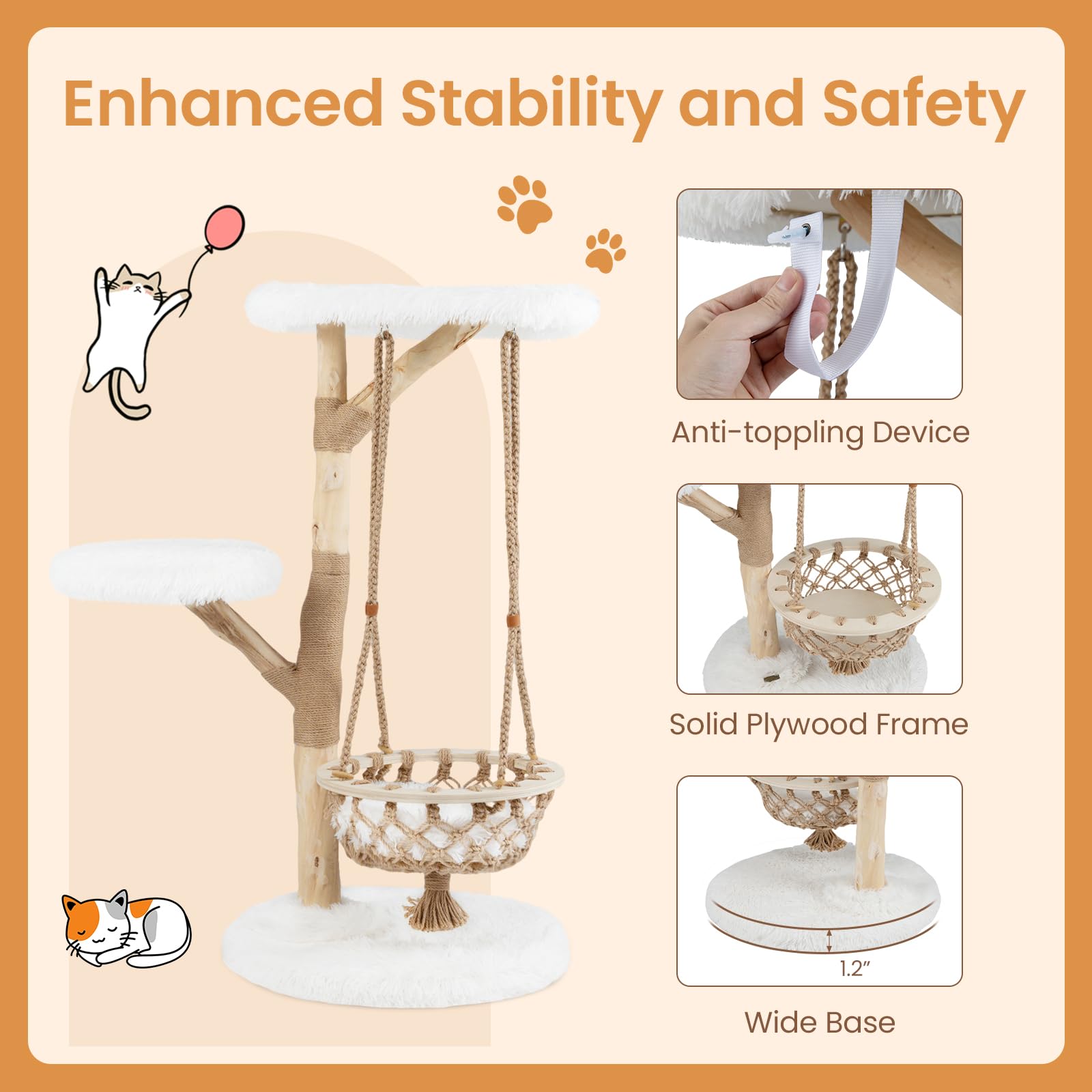 Our cute cat tree measures 24” x 48.5”(Dia. x H) and comes with 4 tiers, providing an ideal sanctuary for your feline companion while not taking up much space. It includes a beautifully hand-woven cradle that gently rocks to soothe your beloved feline, complete with a large top perch and a round padded platforms, providing diverse resting spots. All platforms are covered in ultra-soft plush fabric, pampering your kittens with ultimate comfort. More than that, it boasts a solid wood trunk, ensuring excellent durability, while the trunk wrapped in natural jute ropes also encourages cats’ natural instincts. Plus, it is supported by a plywood frame and secured with an anti-toppling device, ensuring it remains stable no matter how playful your pet gets. This elegant cat tree not only serves as a functional playground for your pet but also doubles as a chic addition to your decoration!