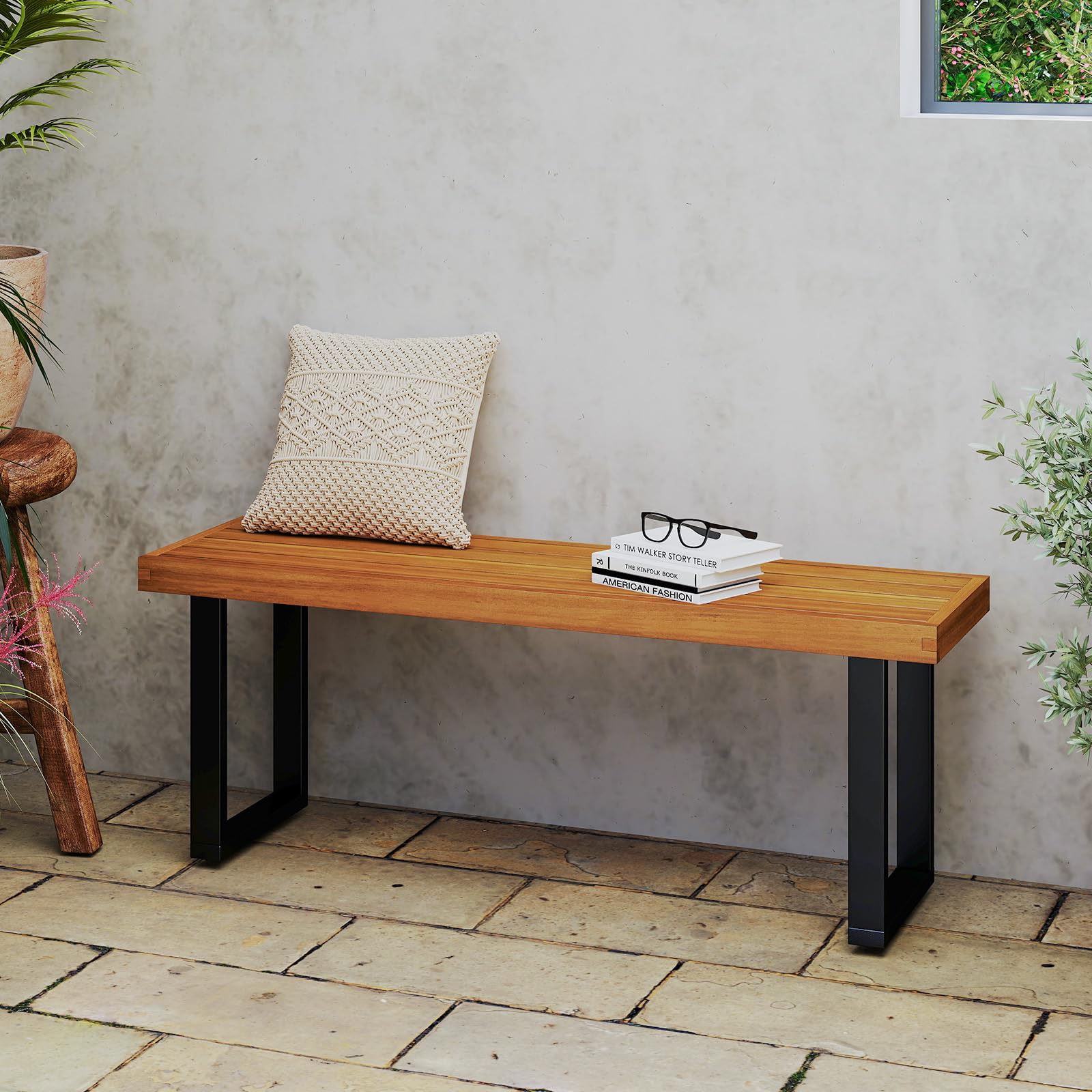Our wooden dining bench measures 48" x 14" x 18" (L x W x H), which could comfortably accommodate 2 persons. Constructed from solid acacia wood, renowned for its strength and natural durability, the bench is designed to withstand the elements while maintaining its elegant appearance. Moreover, it features a robust metal frame that provides a sturdy base capable of supporting up to 800 lbs/360 kg, coupled with foot pads for enhanced stability on the slightly uneven floors. The slatted wooden bench top ensures proper ventilation, making cleaning and maintenance a breeze. Whether it's a picnic in the park or a cozy get-together in your backyard or dining room, this rustic indoor and outdoor furniture is sure to elevate your seating experience.