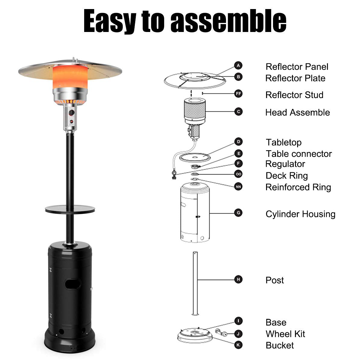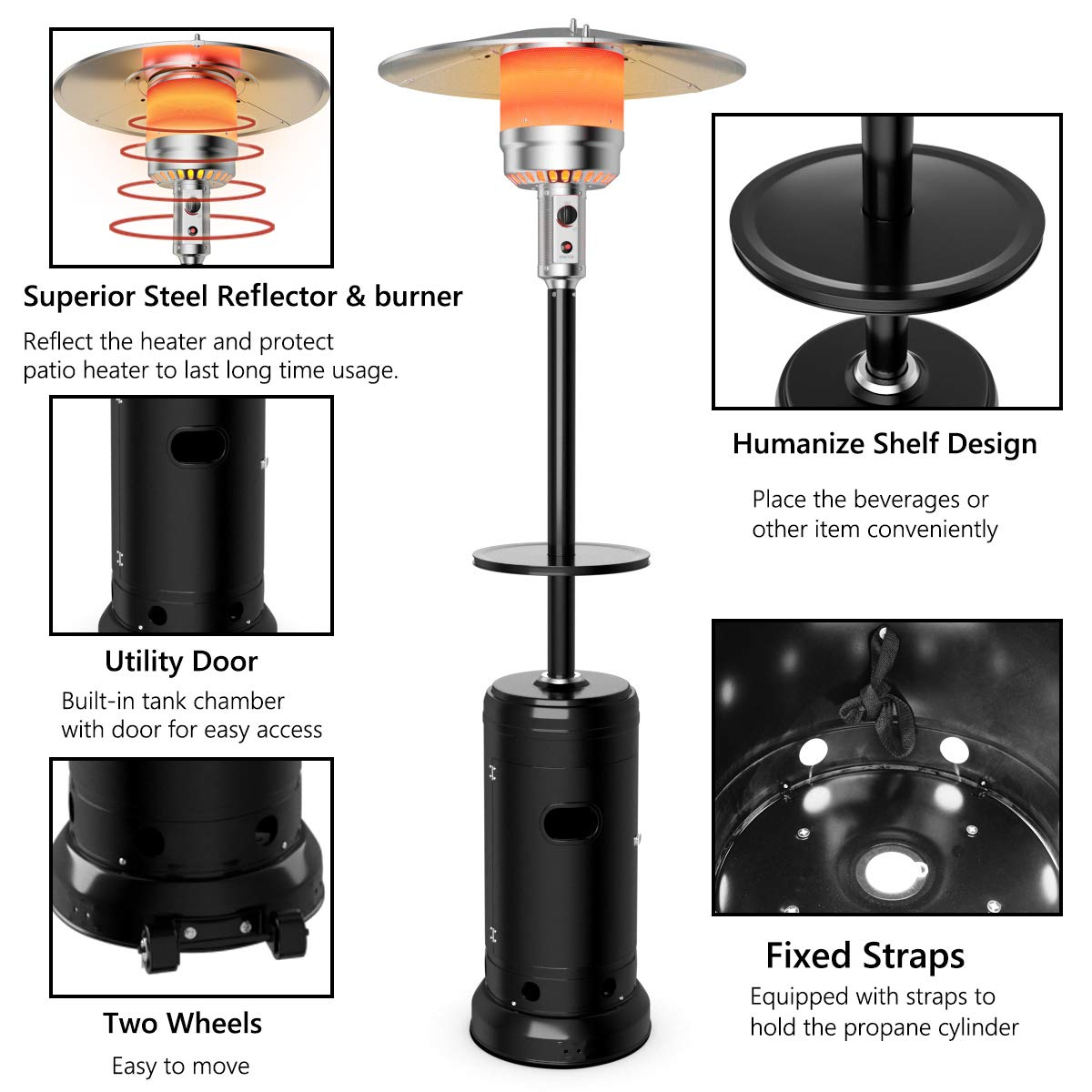 - User-Friendly Design: Comes with two small wheels at the side, our patio heater stand can be easily transported anywhere you like without any load, And it features a built-in space for hiding the fuel tank to save space, Add an extra shelf for you to place some drinks and wines, you can enjoy the leisure time with your friends or family at all times, no matter what the location.