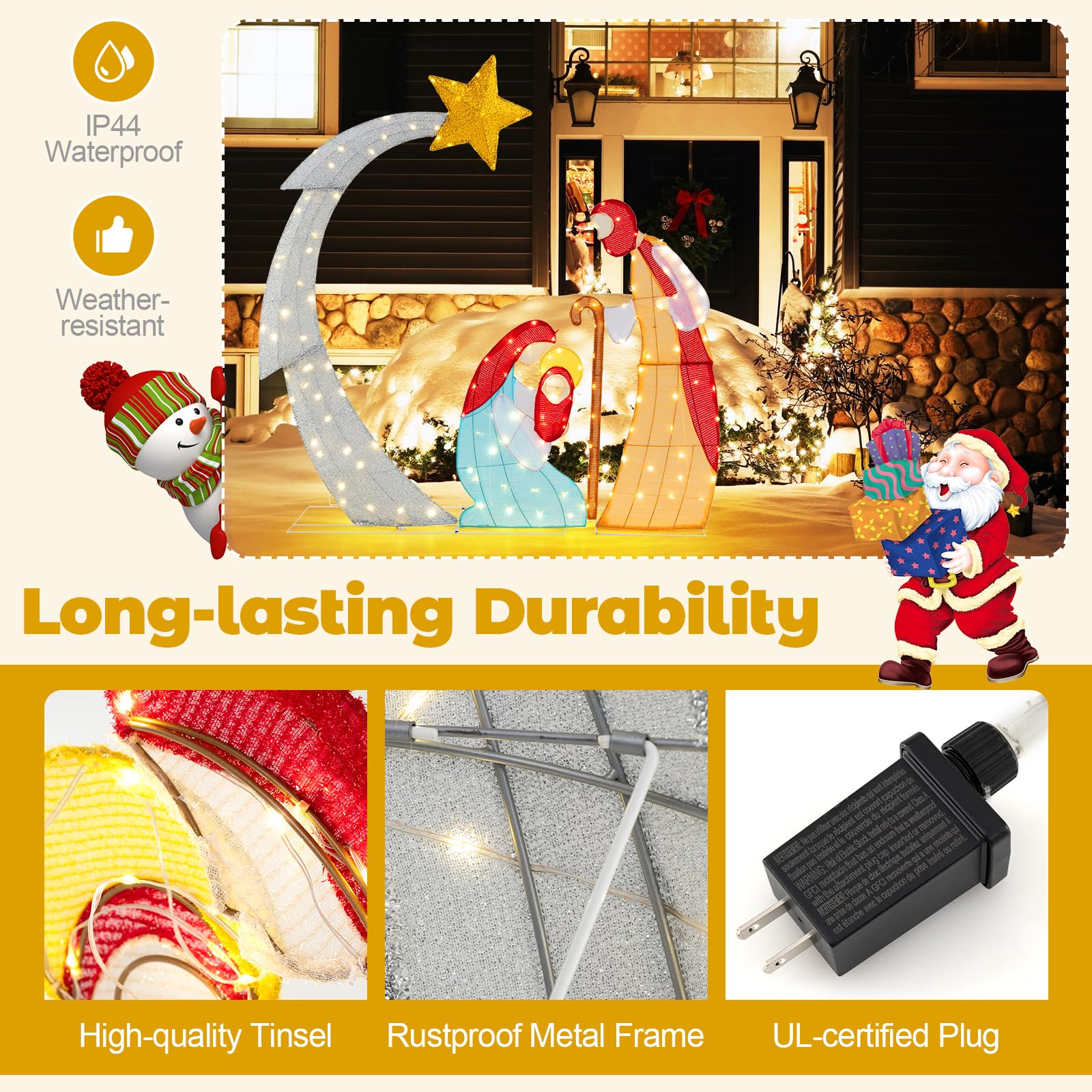 - Long-lasting Durability: Crafted with all-weather, snow-proof tinsel fabric and a stable metal frame, this pre-lit nativity set is built to withstand the elements, promising it remains beautiful throughout the holiday season.