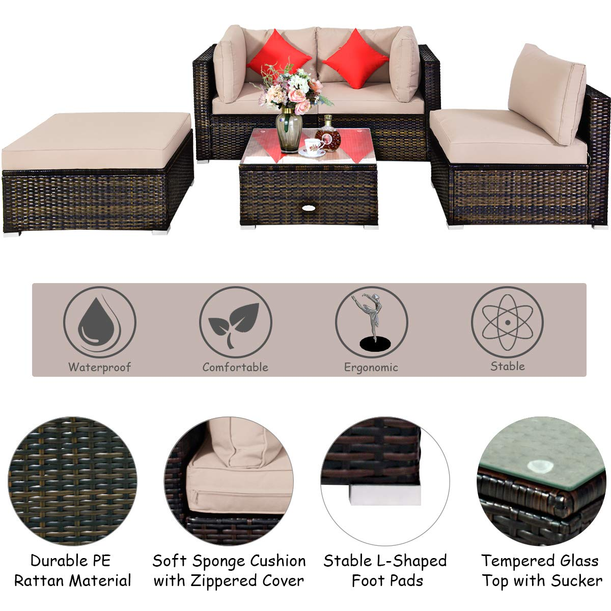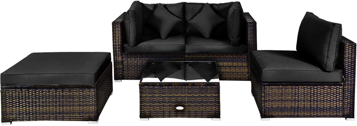 Are you waiting for a proper rattan chair set to spend your leisure time? A sturdy steel frame with all-weather PE rattan can keep stability and durability for long-time use. Soft cushions will hold you comfortably and the cover of the cushion can be removed with a smooth zipper. There is enough space to provide enough sitting space for several people. You can also regard the coffee table as an ottoman by removing the tempered glass top for more sitting space. Featuring 1 armless sofa, 2 corner sofas, 1 ottoman, and 1 coffee table, this patio furniture set can be combined in various ways according to your different needs. Just sit on the sofas and enjoy the sunshine in front of the pool or on the patio with your loved ones.