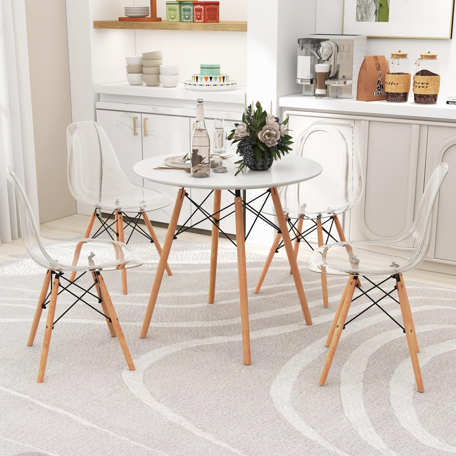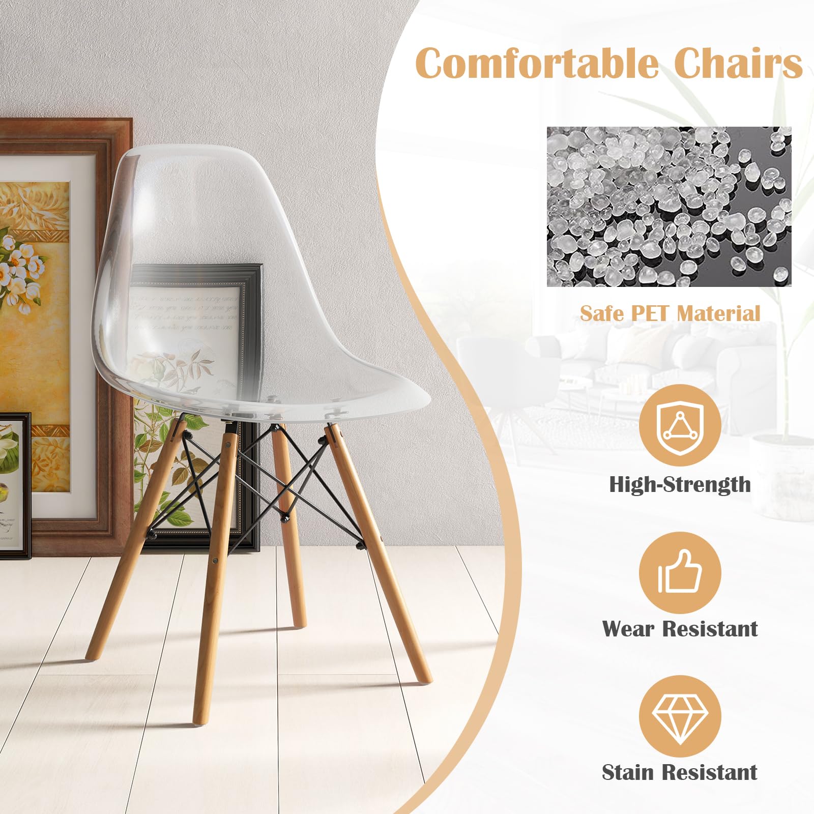 • Comfortable Dining Chairs: For comfort, each dining chair has an ergonomic backrest to fit human curves for reliable support. Meantime, the PP seat is spacious enough to create a comfy spot for long-time sitting.