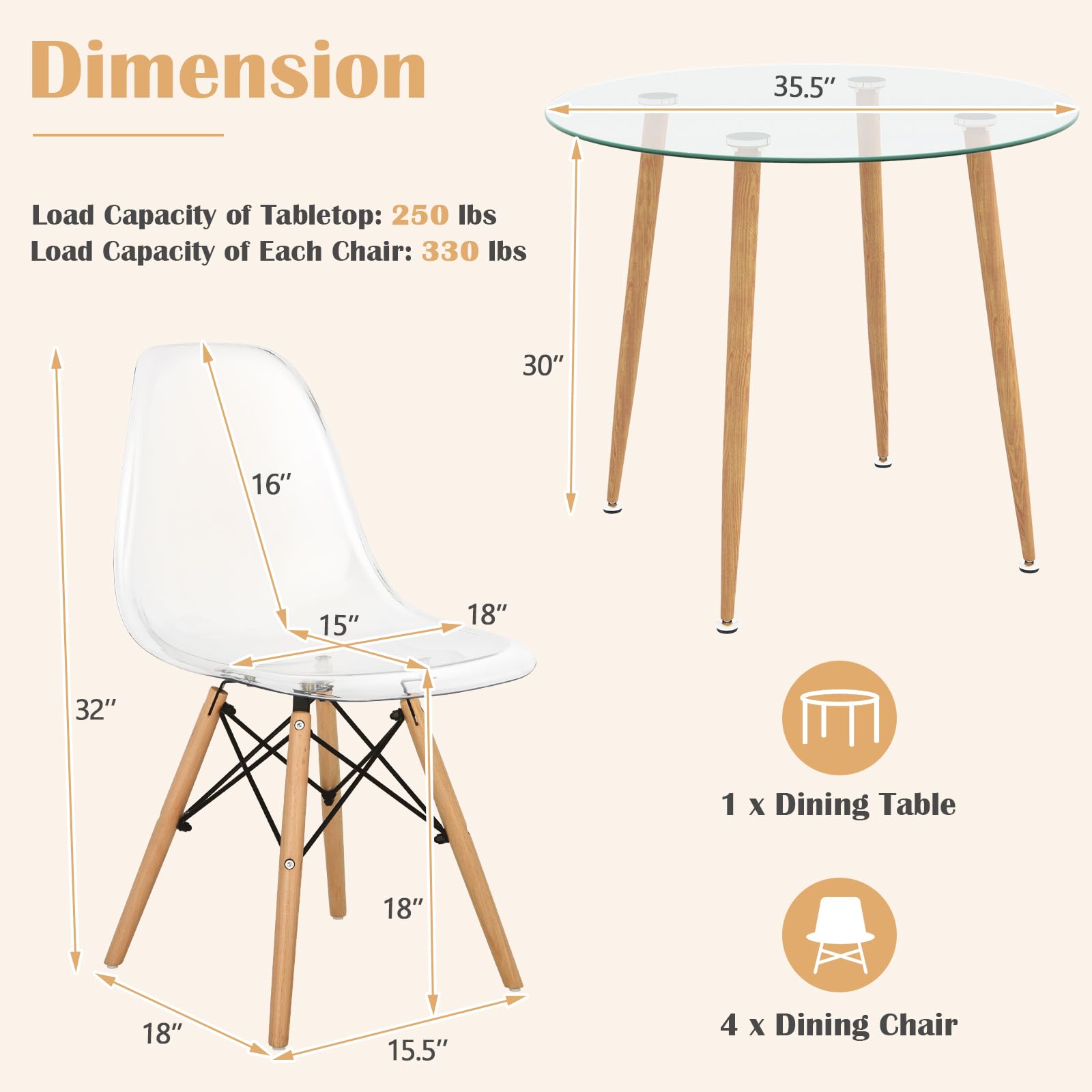 Elevate your dining space with our stylish Table Set for 4,?including?a dining table and four chairs. The tempered glass tabletop is both elegant and easy to clean, while the ergonomic chairs offer comfort and support. Sturdy metal and beech wood legs ensure stability, and assembly is a breeze with detailed instructions. Dimensions: Table - 35.5"L x 35.5" W x 30"H, Chairs - 19"L x 18" W x 33"H. Perfect for formal dinners or casual family meals.