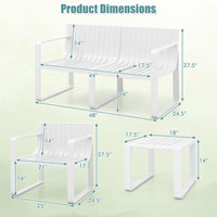 This comprehensive set includes 1 loveseat, 2 patio chairs, and 2 side tables, providing a cozy and spacious space for relaxation and casual conversations. Made from all-weather material, this patio furniture set withstands long-term outdoor use. The slatted design not only adds style but also facilitates quick drying after rain. The loveseat and chairs feature comfortable contours, designed to accommodate the natural curve of the body. In addition, the side tables offer a convenient place to hold your drinks, food or decorations.