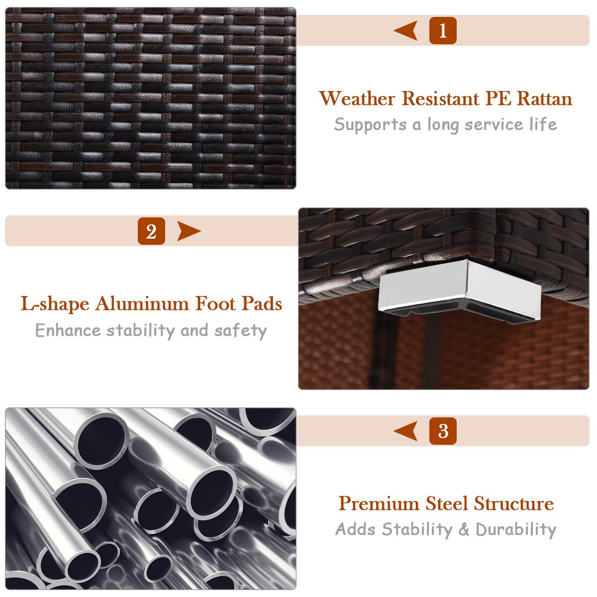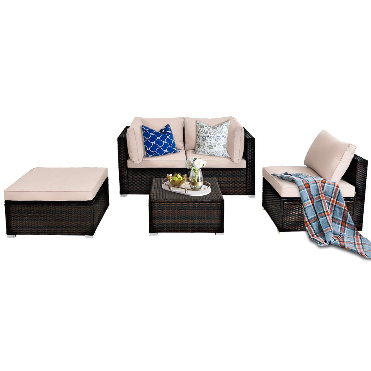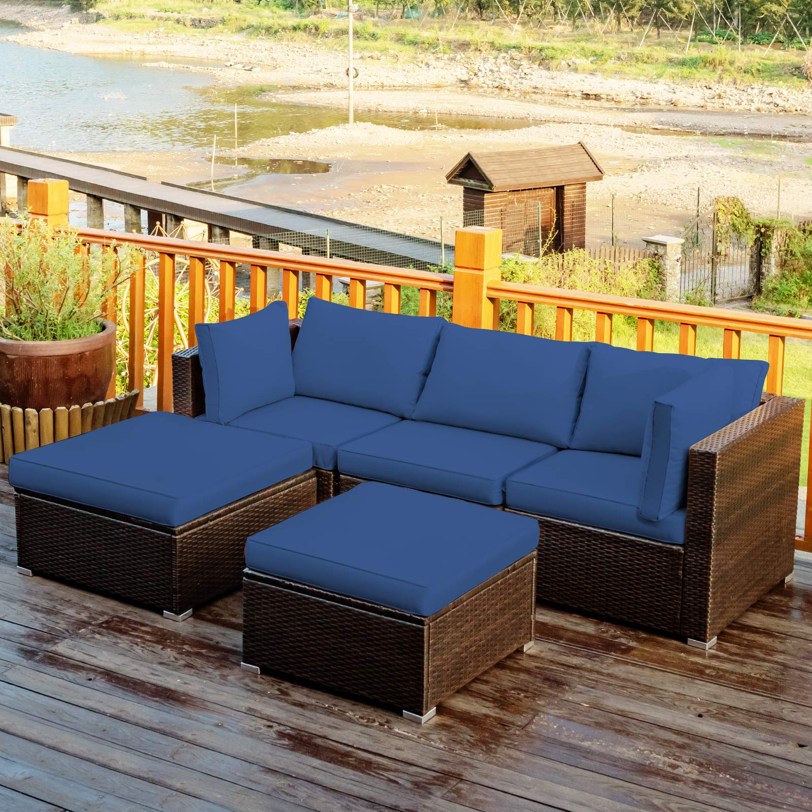 Enjoy your outdoor leisure time with this 5-piece rattan sectional seating group! Our 5pcs rattan sofa set includes 2 corner sofas, 1 armless sofa, and 2 ottoman sofas. Each piece of this set is made of a sturdy steel inner frame and wrapped in hand-woven PE rattan. Each component of this set can be used individually or in combination, easily changed to different layouts and combinations based on your need. You can also regard the ottoman as a coffee table by removing the cushion. Thick sponge-padded cushions with polyester fabric cover ensure comfort and durability. And equipped with zippers, the waterproof covers of cushions are easy to remove and clean. Besides, the chic design is perfect for any outdoor space including yards, patios, gardens, porches, or indoors. Our sofa set is suitable for some people to eat and talk.
