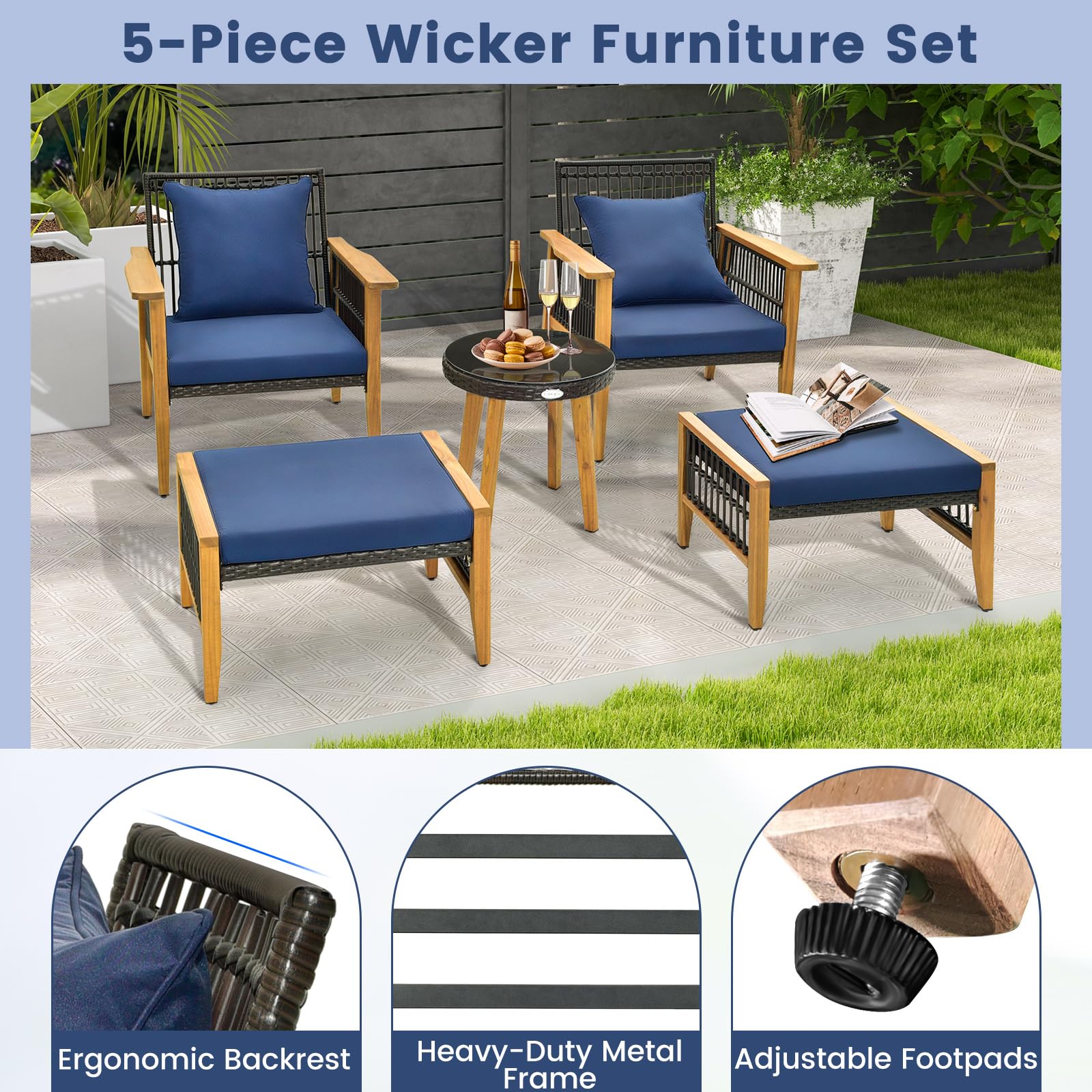 Tangkula 5 Piece Patio Furniture Set, Patiojoy Wicker Chair Set with Coffee Table & 2 Ottomans (Navy)