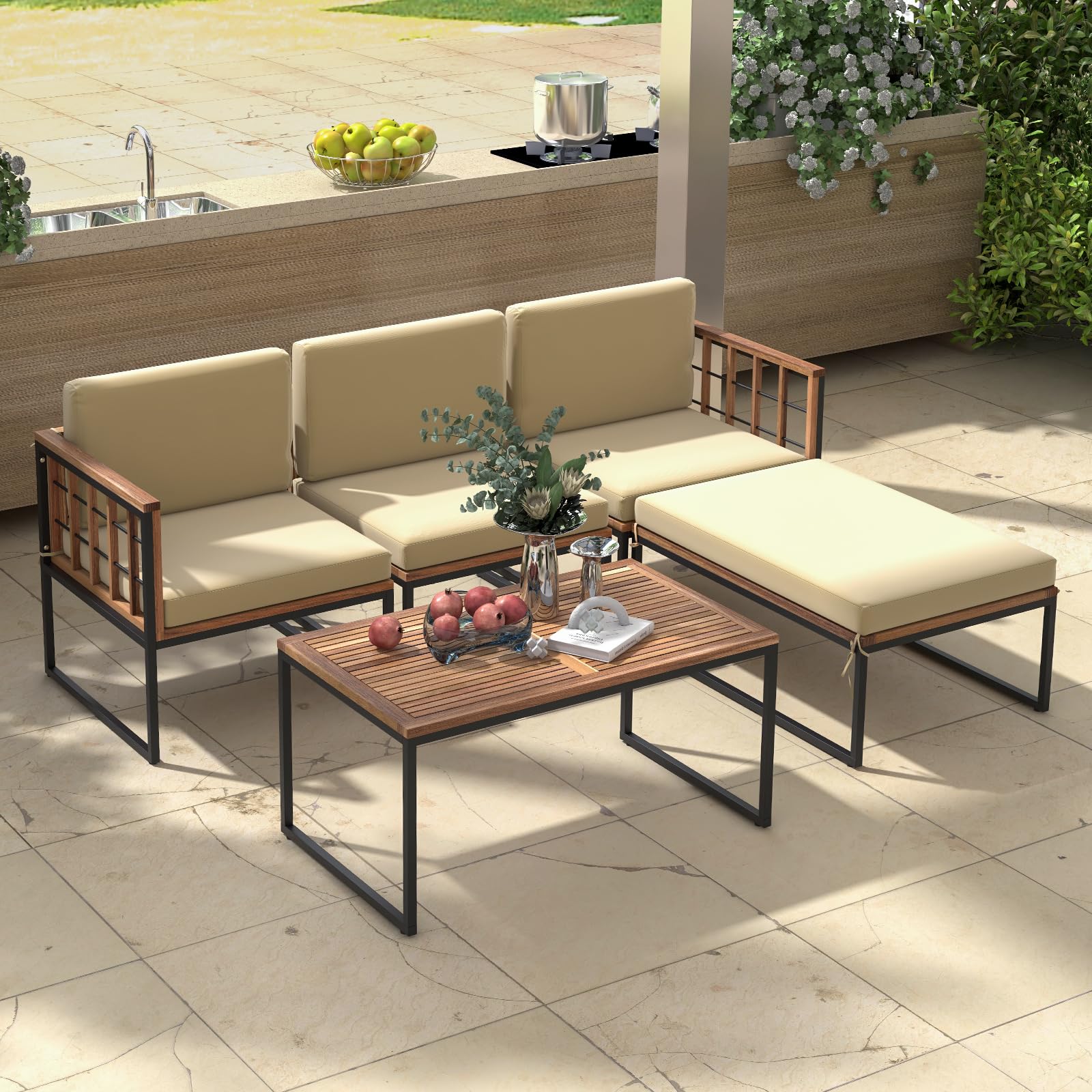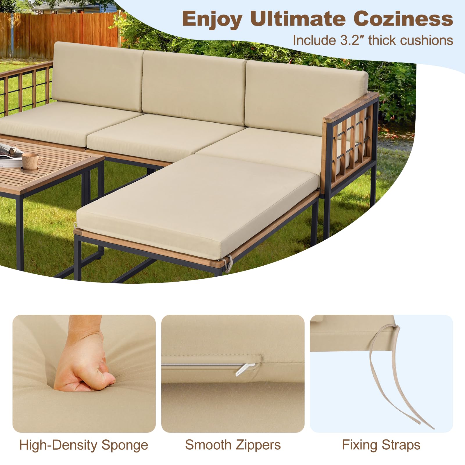Elevate your garden or patio experience with this versatile 5-piece furniture set, designed for ultimate relaxation and socializing. The patio set consists of 3 chairs, 1 ottoman, and 1 generously sized coffee table, which is ideal for hosting intimate gatherings or enjoying peaceful solo moments in the fresh air. The thick and elastic cushions invite hours of comfort and feature convenient zipper covers for stress-free upkeep. The sturdy construction combines premium acacia wood with robust metal supports, promising endurance through the seasons. With the ability to rearrange each piece, this set offers flexibility to fit a variety of outdoor spaces, ensuring your exterior decor is both stylish and functional. Enjoy your open-air sanctuary with this elegant and durable patio collection.
