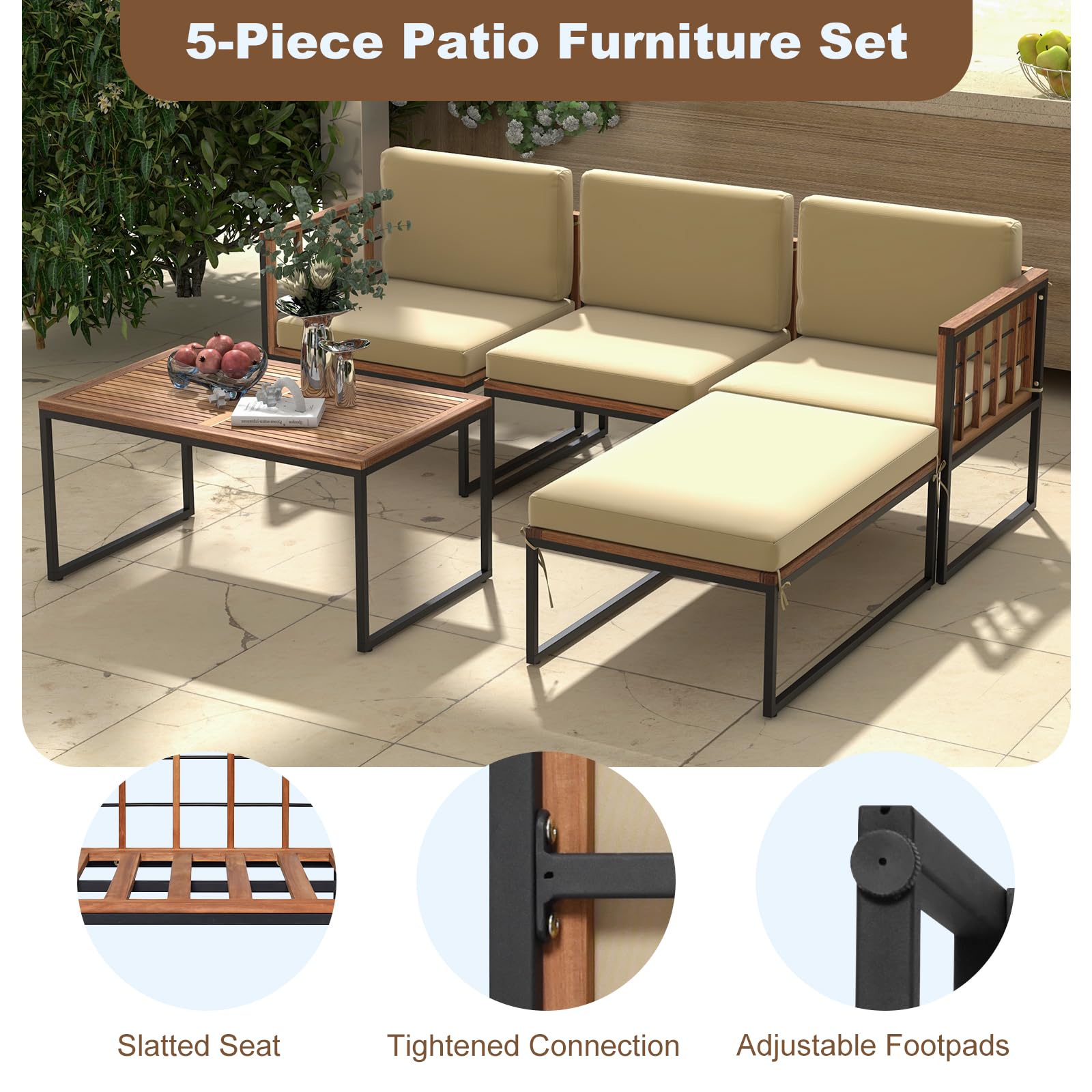 - Well-Crafted Patio Set: This 5-piece patio furniture set is designed with slatted seat to avoid water accumulation. Plus, the tightened connection and adjustable footpads highly improve the overall stability of the whole set.