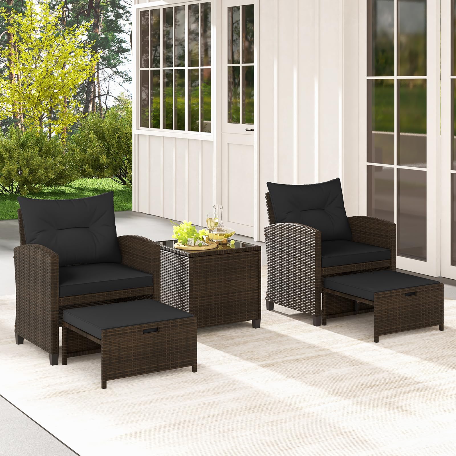 Crafted with built-to-last and fade-resistant PE rattan, the whole patio set adds a touch of sophistication to any space. And the chairs are comfortable to sit with ergonomic backrest and curved armrests. Moreover, the cushions on the chairs and ottomans bring you more coziness. And the versatile ottomans serve as footrests, extra seats or side tables for more convenience. This 5-piece patio set combines comfort and style, creating an inviting oasis for leisure moments.
