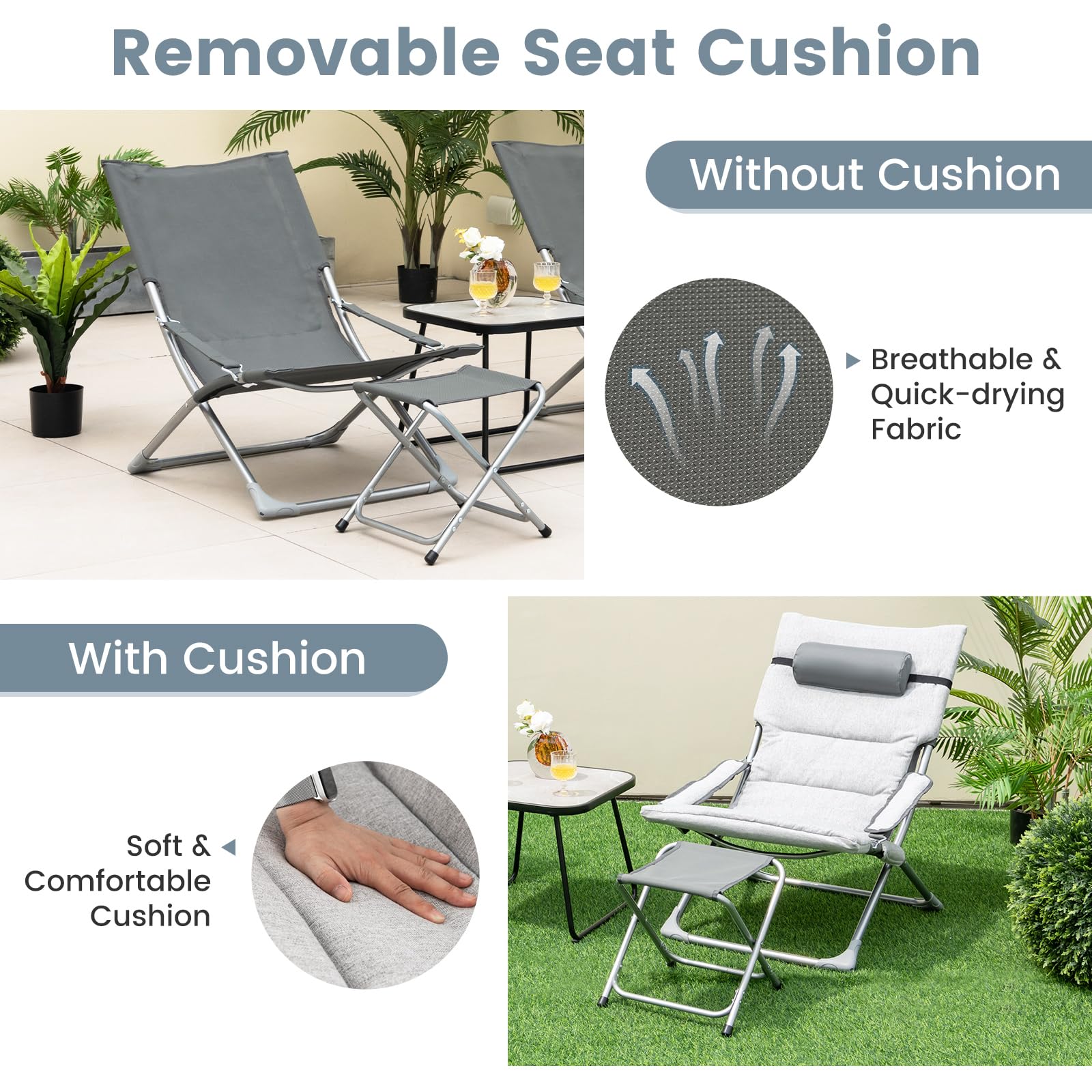 - Removable Seat Cushion: The 2 sling chairs feature removable seat cushions and headrest pillow for all-season use. When used without cushion, the chairs keep you away from hotness with the breathable and quick-drying fabric. And you can also use it with soft and comfortable cushion for more coziness.