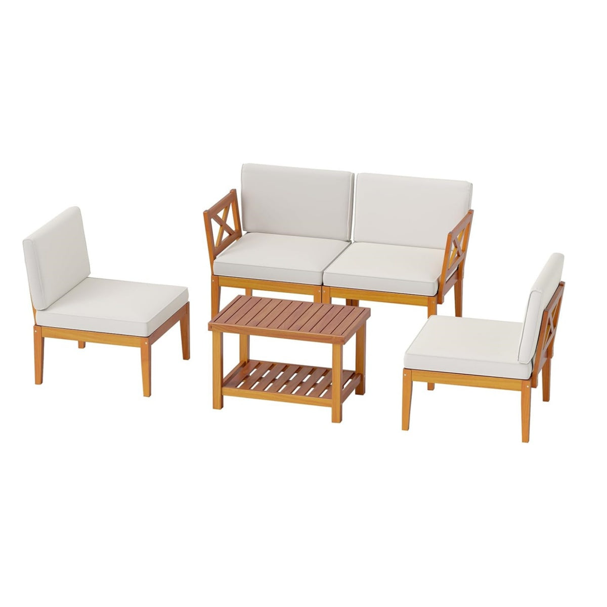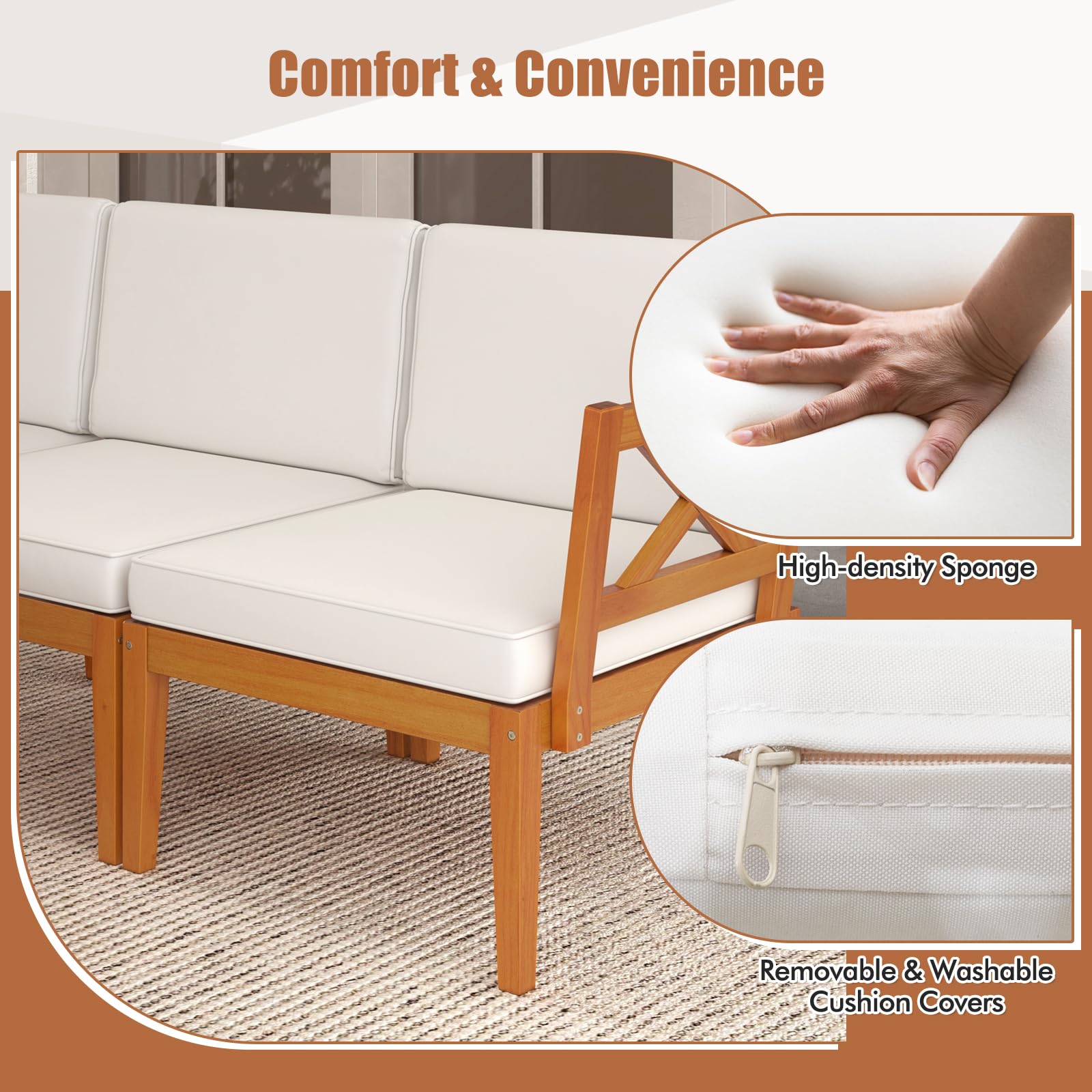 Crafted from solid acacia wood, this patio set offers exceptional stability and longevity. Enjoy the comfortable and maintainable soft cushions with removable covers for easy cleaning. The stylish 2-tier coffee table of this outdoor bistro set not only complements your decoration but also provides convenient storage options. Additionally, the modular design allows you to tailor the setup to fit your space perfectly, making it an ideal choice for any outdoor area.