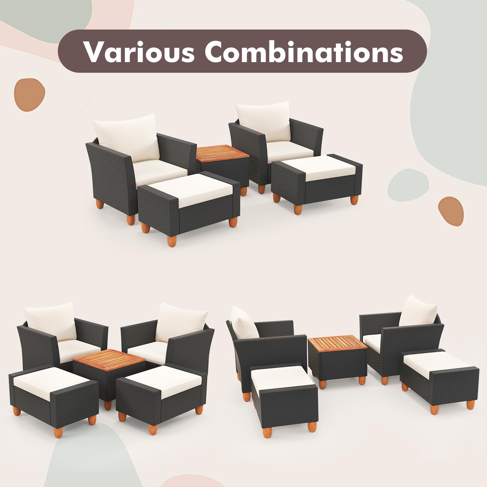 With ample interior storage space, the side table keeps your outdoor essentials neatly organized and easily accessible. The soft pillows and cushions provide unparalleled coziness, with smooth zippers making their covers easy to remove and maintain. The ottomans can be used as footrests, extra seating options, or even coffee tables, adding versatility to your outdoor space. Made from hand-woven PE rattan and high-quality acacia wood, this patio conversation set promises longevity and sturdiness. Each armchair and ottoman supports 400 lbs, while the storage table holds 240 lbs. This outdoor furniture set offers various layout options, allowing you to enjoy leisure time outdoors no matter where you are.