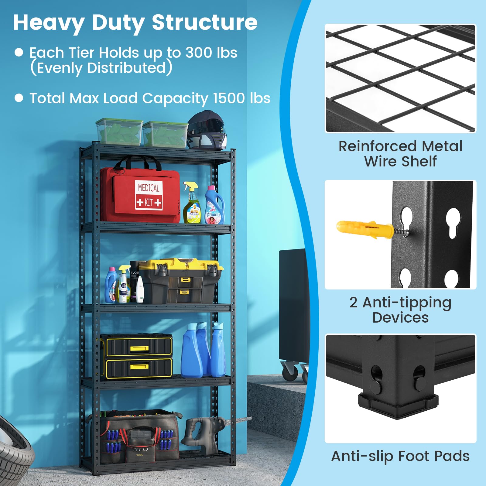 Made from high-strength powder-coated metal, this garage shelving unit is built to last and can provide sturdy support for all your items. Each tier can hold stuffs up to 300 lbs. This 5-tier vertical storage rack provides large storage space without taking up much floor space. Besides, you can easily adjust the shelf heights to fit your specific storage needs. The shelf can also be easily disassembled into two separate smaller units to fit different items & occasions. Designed with safety in mind, this 5-tier garage shelving unit comes with two anti-tipping devices. Additionally, the bottom anti-slip foot pads are equipped with to prevent any unwanted sliding or scratches on your floors.