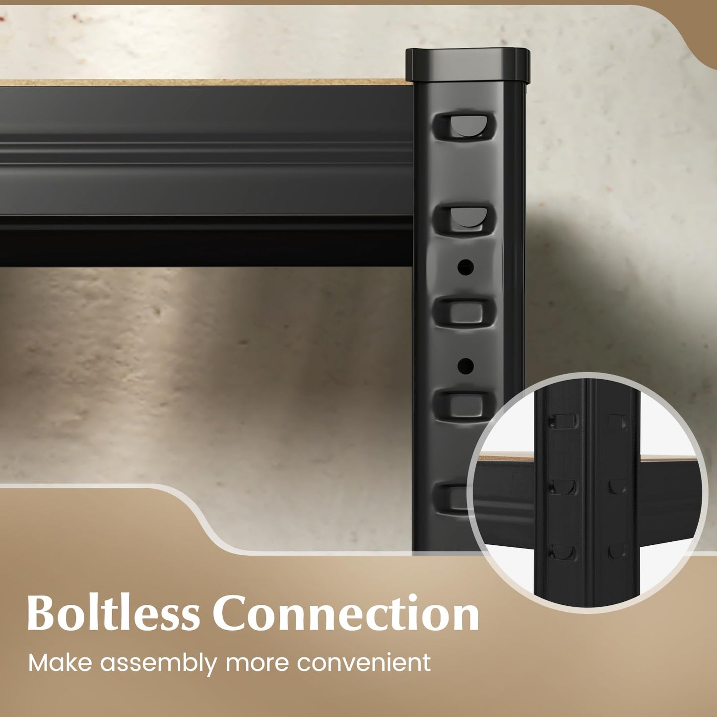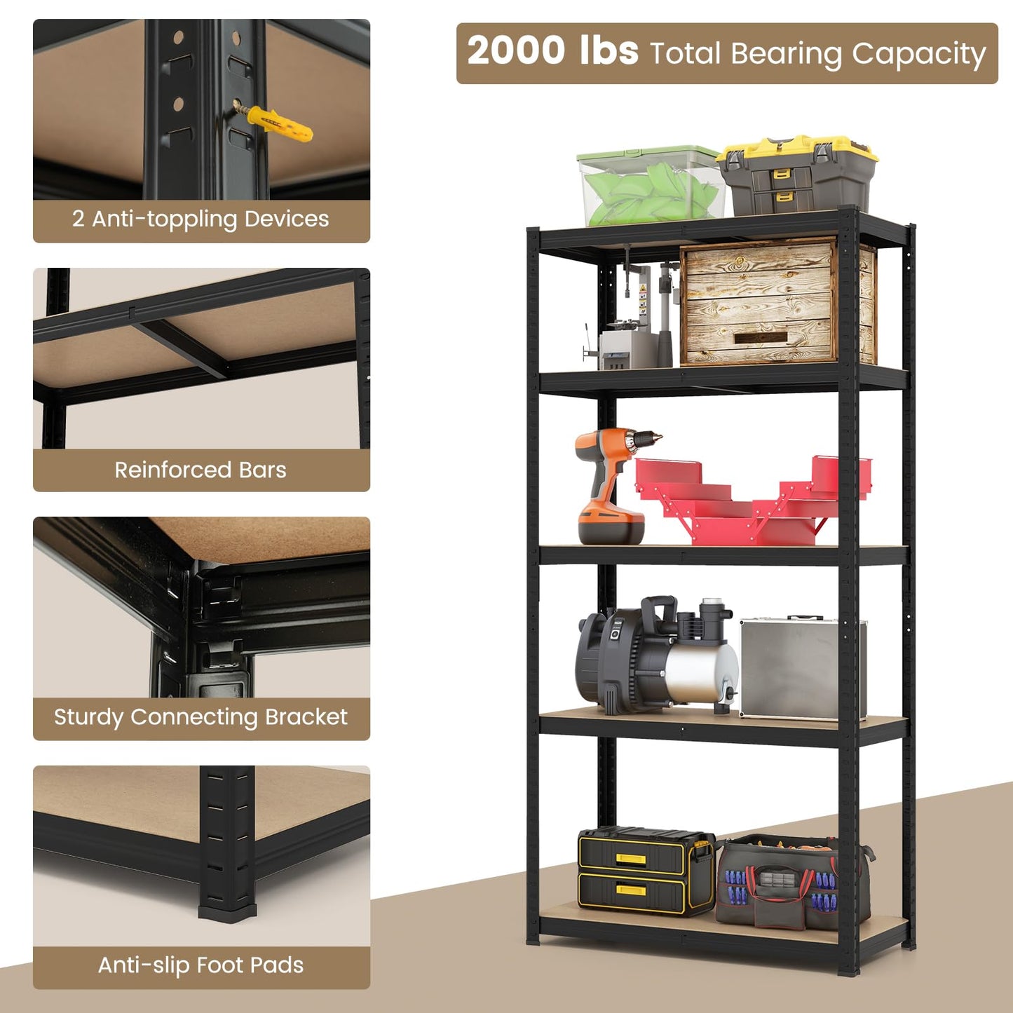 - Added Safety & Stability: Equipped with 2 anti-toppling devices for a safe work or living space, this shed shelving unit also features anti-slip and anti-scratch foot pads to ensure extra stability and protect your floors.