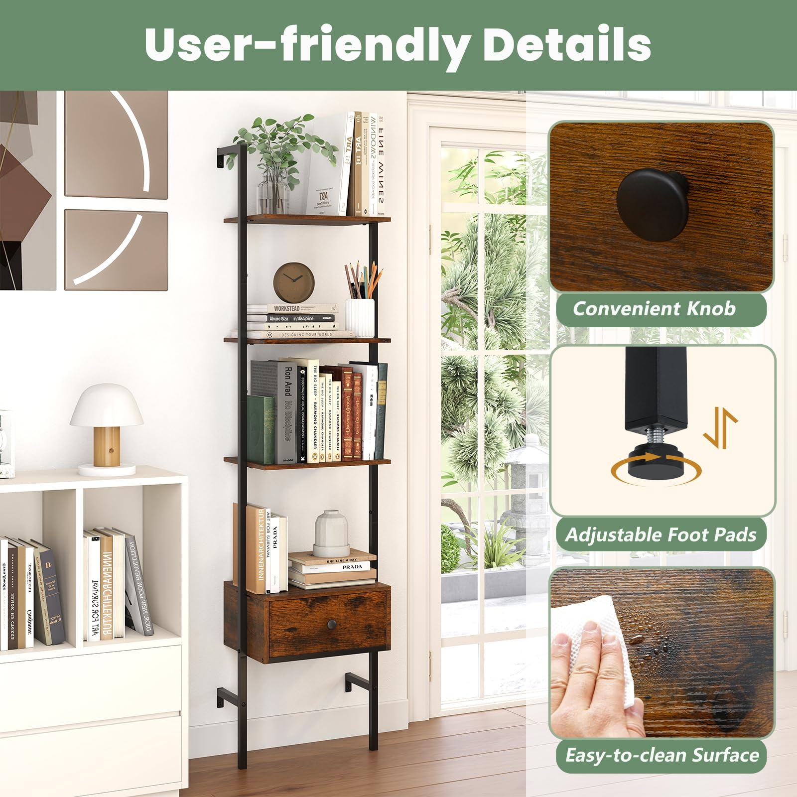 Featuring 4 open display shelves and a convenient drawer, this storage organizer provides ample space to showcase books, photos, and decorations while keeping smaller items neatly tucked away. Moreover, the anti-tipping fittings secure the unit safely to the wall, ensuring peace of mind. Built to last, this ladder bookshelf is supported by robust metal frame. Merging industrial design with functionality, this wall-mounted bookcase not only furnishes your space with a trendy aesthetic but also utilizes vertical space efficiently.