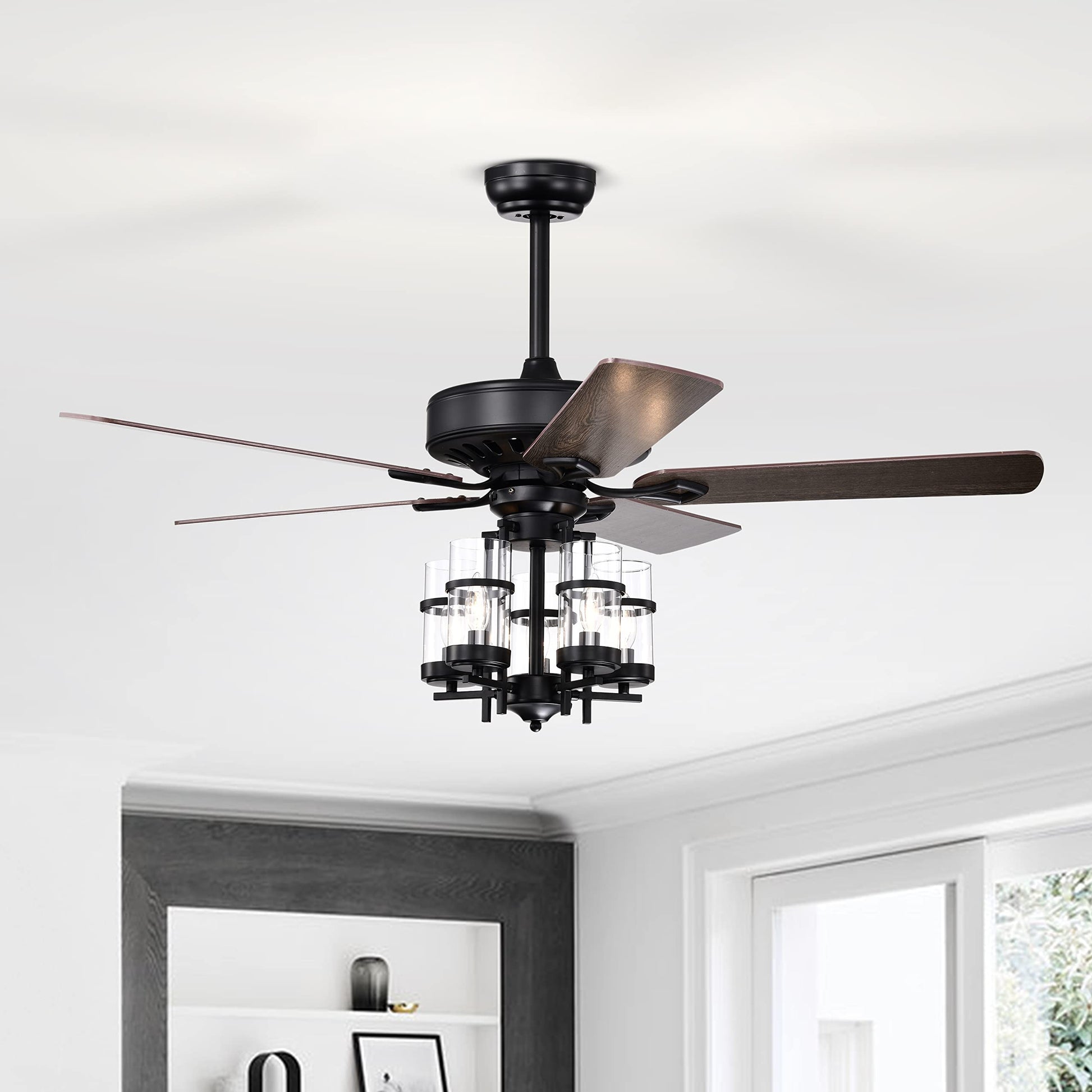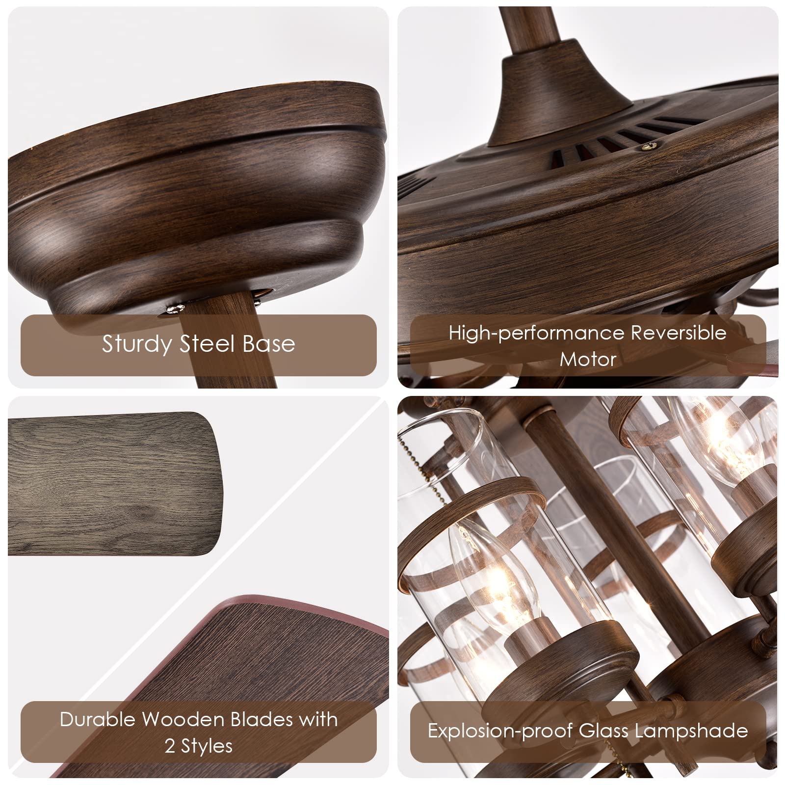 The simple but elegant design of our 50’’ ceiling fan lamp creates a classical decoration for your home. Solid base and explosion glass lampshades ensure excellent stability and durability. Moreover, 5 smooth MDF blades with different colors on both sides can be reversed, which will provide cold wind in summer and promote air circulation in winter. Besides, reversible motor with 3 speeds can be easily controlled by the remote. With down rods of 5’’ and 10’’, you can assemble the ceiling fan in the suitable height based on the height of the room. Our modern ceiling fan with light will be a wonderful addition to your living room, dining room, bedroom and more.