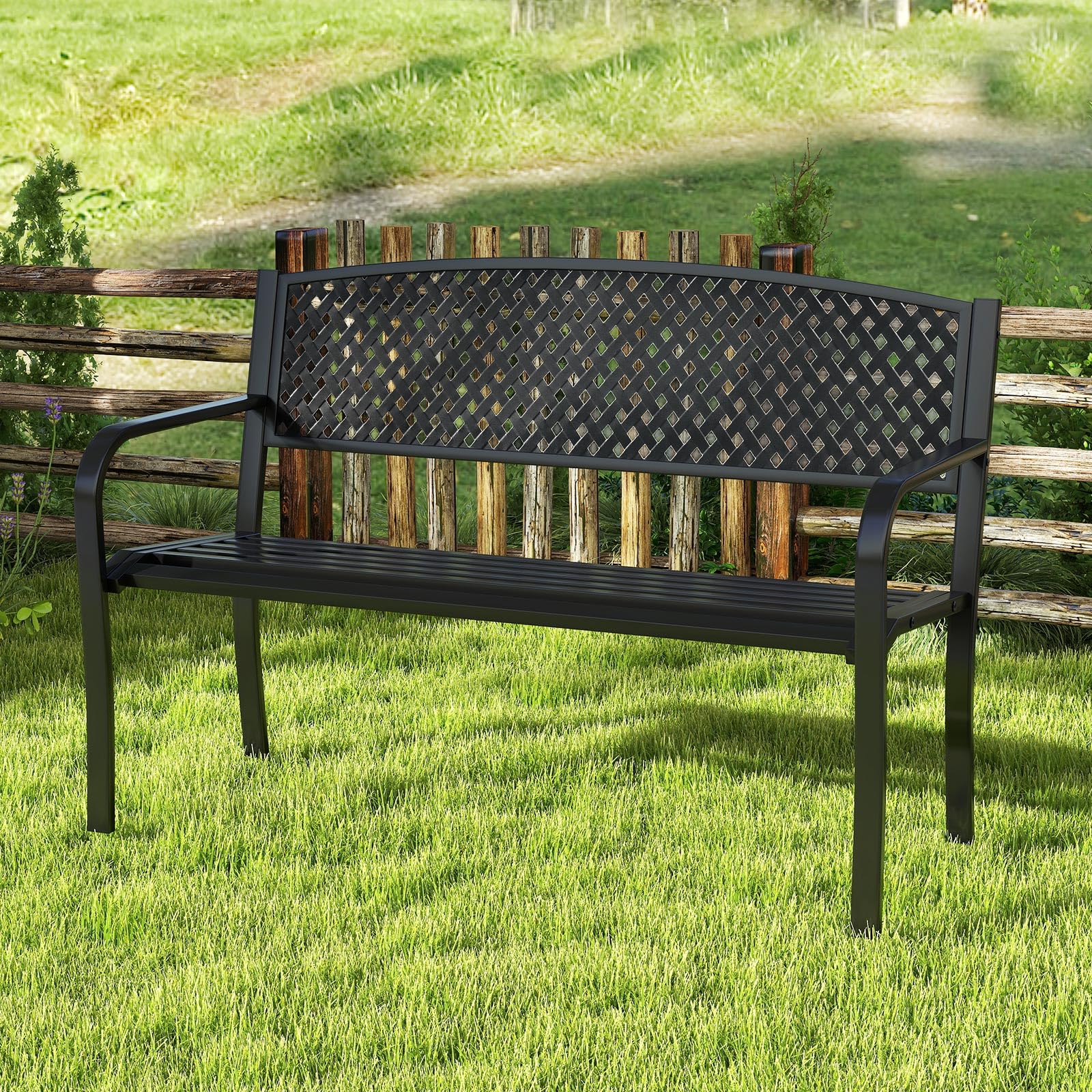 Constructed with heavy-duty metal, this patio bench ensures long-lasting reliability and accommodates up to 660 lbs. Its wide seat comfortably seats 2-3, while the comfortable backrest and armrests provide upgraded coziness. With its timeless and chic appearance, this garden bench adds a touch of elegance to a variety of outdoor settings, from the backyard to the front porch, and even the park. For simple installation, this metal loveseat chair boasts a simple structure and comes with a detailed instruction.
