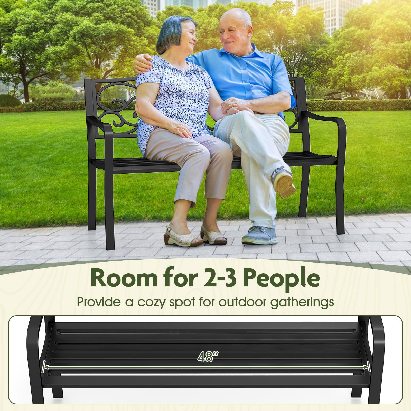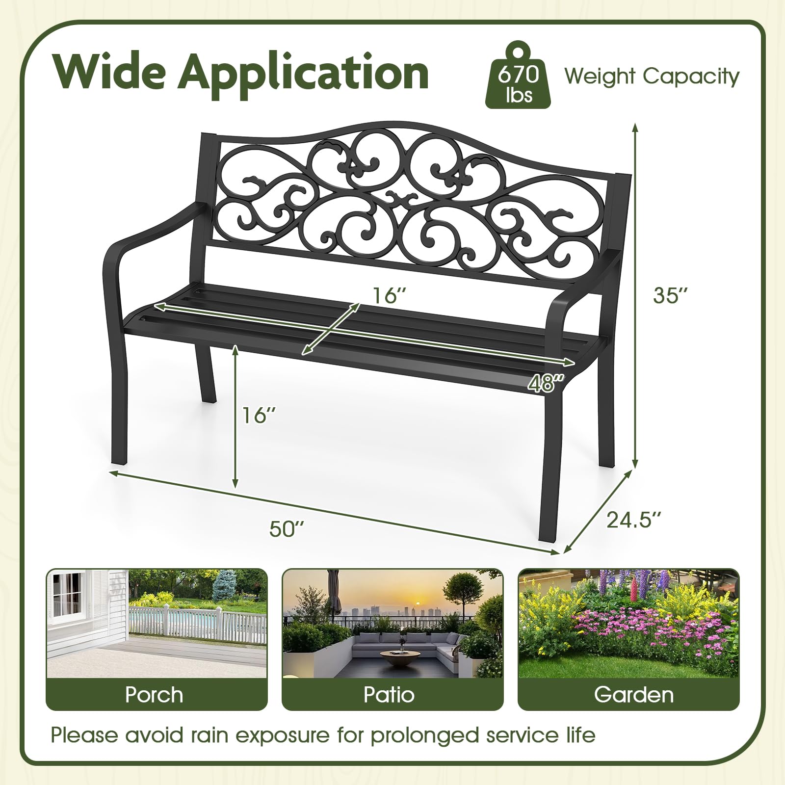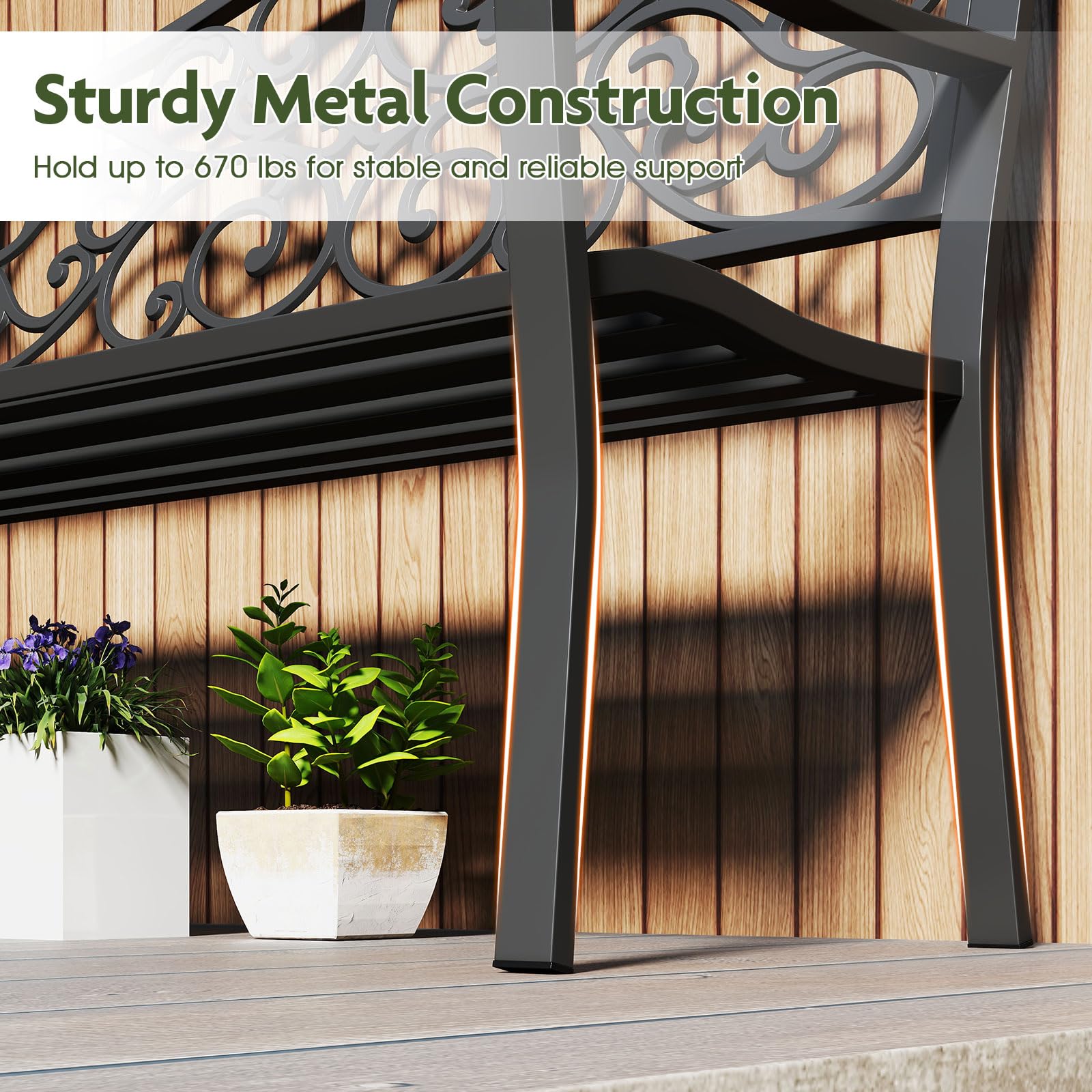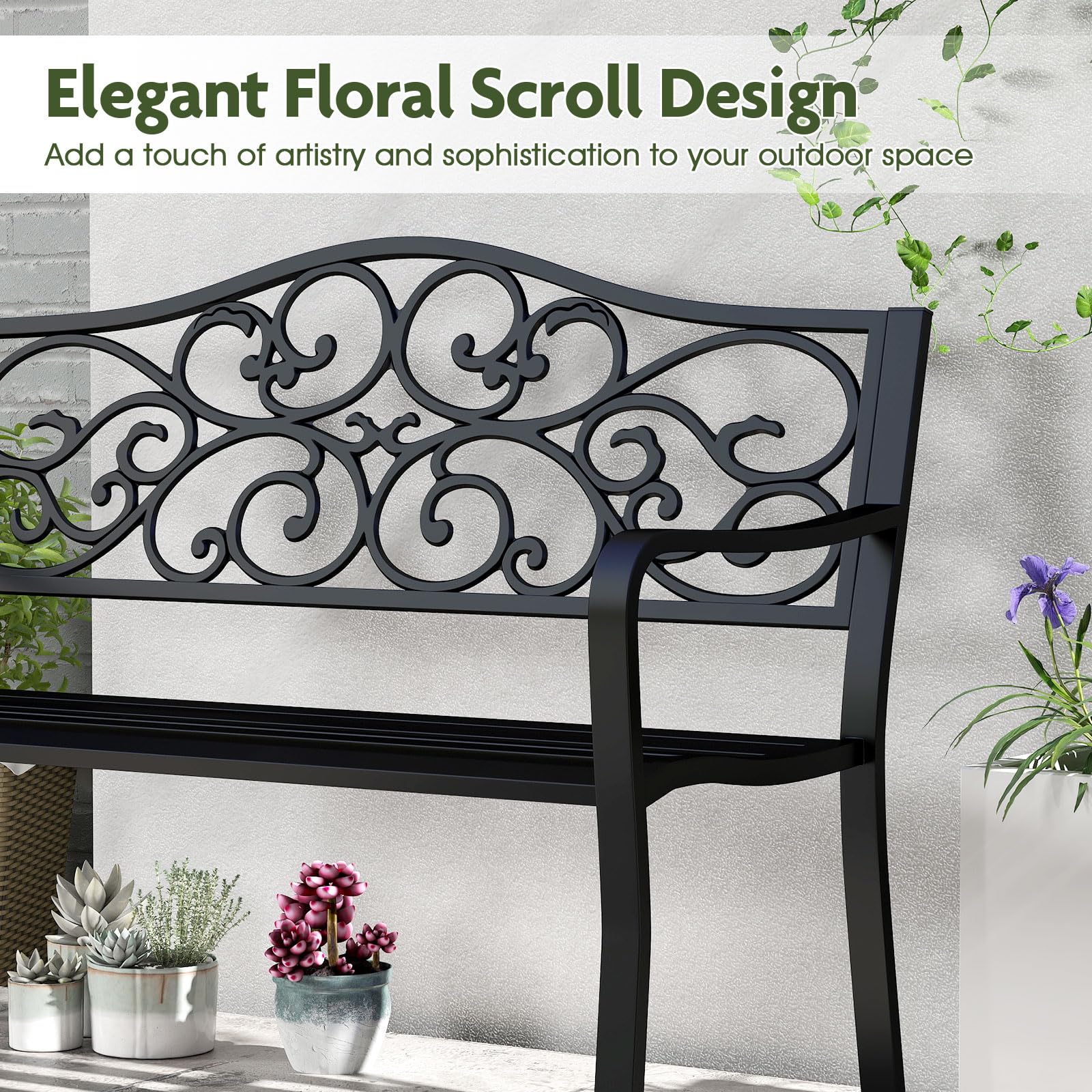 Beautifully designed with a sophisticated floral scroll backrest, this outdoor furniture not only adds a touch of artistry but also complements your garden or patio decoration. Its sturdy cast iron metal frame and backrest support up to 670 pounds, offering both durability and stability. Moreover, this park bench is ergonomically crafted with a 105° inclined backrest, curved armrests and a contoured, slatted seat, ensuring maximum comfort for 2-3 people.
