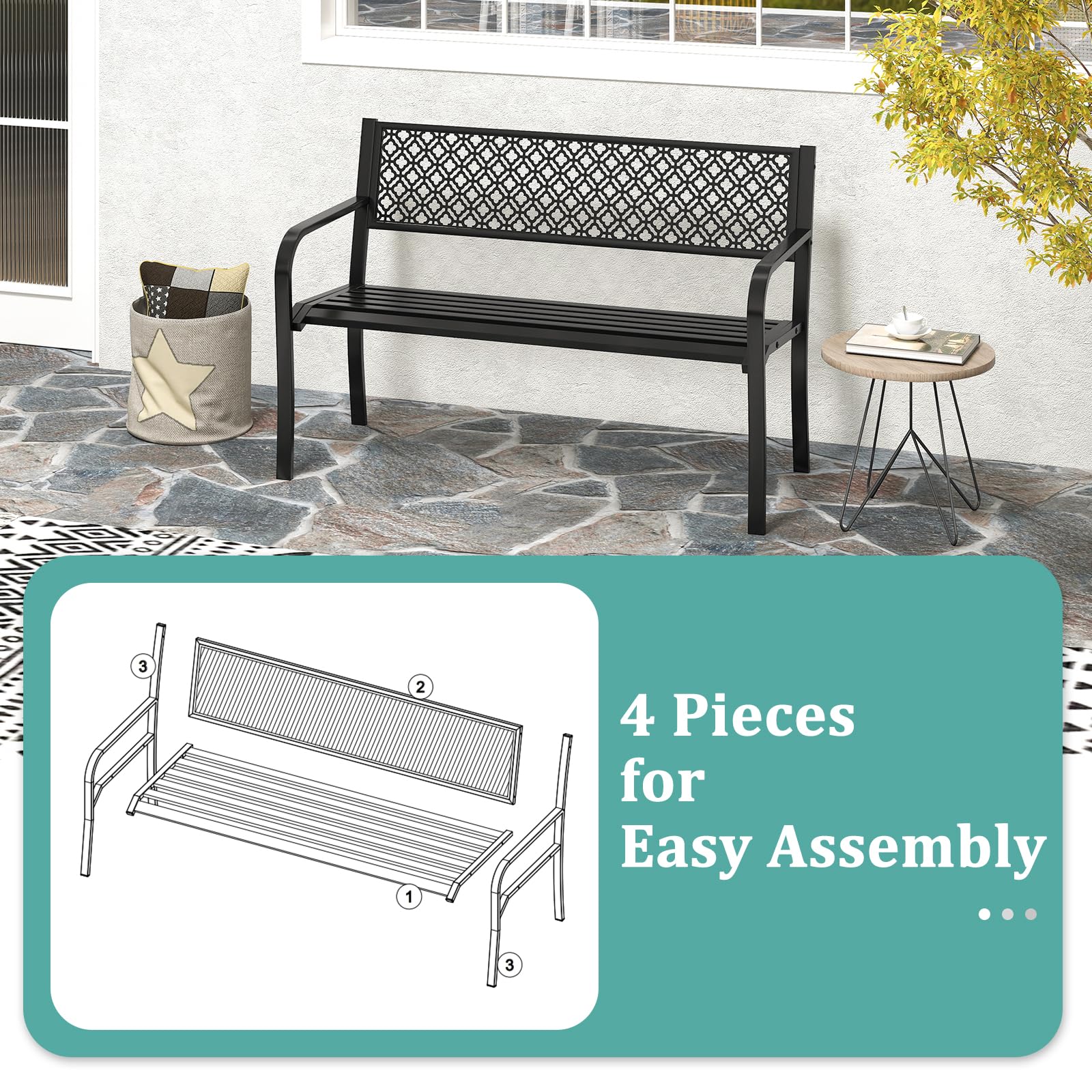 Featuring a sturdy metal construction, this outside bench comfortably supports up to 790 pounds and promises long-lasting durability. Additionally, this outdoor furniture combines a roomy 50-inch width with an ergonomic design, including an inclined backrest, curved armrests and contoured, slatted seat for unparalleled comfort, making it ideal for intimate conversations or gatherings with loved ones. The elegant geometric lattice patterns on the backrest inject a modern twist into various settings, making this metal bench a versatile choice for your garden, patio or front porch.