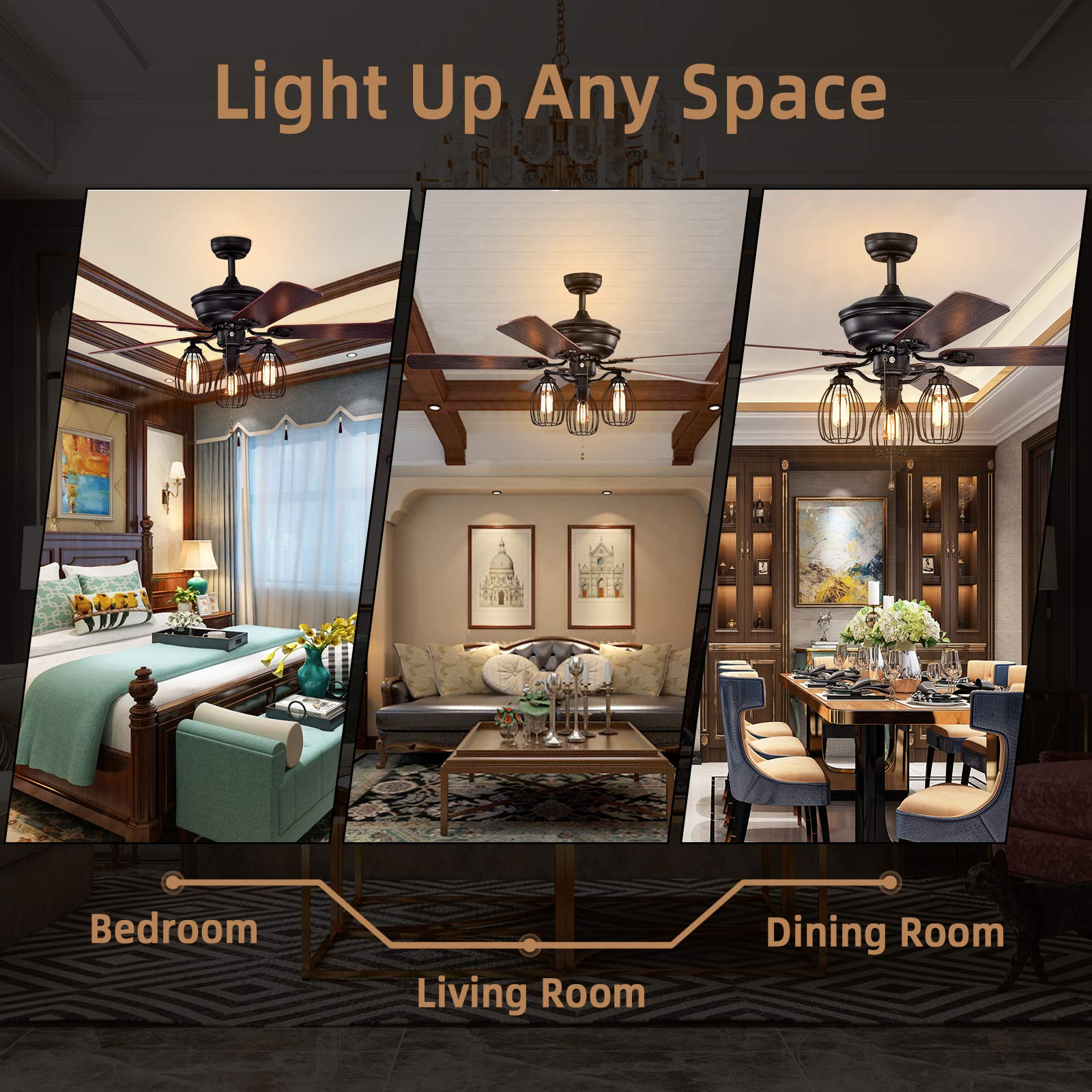 Our 52" ceiling fan with light allow you to illuminate while getting the most comfortable air circulation (no bulbs are provided).The silent motor of this ceiling fan can create a quiet living environment without affecting the quality of your sleep. At the same time, it can provide a stable and strong power supply and allow you to choose between 61rpm, 99 rpm and 164 rpm at will. The reversible electric fan can choose different air circulation directions, making you warm in winter and cool in summer. What's more, the ceiling fan with light can be adjusted in height through the included 5-inch and 10-inch downrods to ensure proper distance from the ceiling and optimize air flow. The pull chain control is included in the package, so you can easily control the switch to turn on/off and adjust the fan speed.