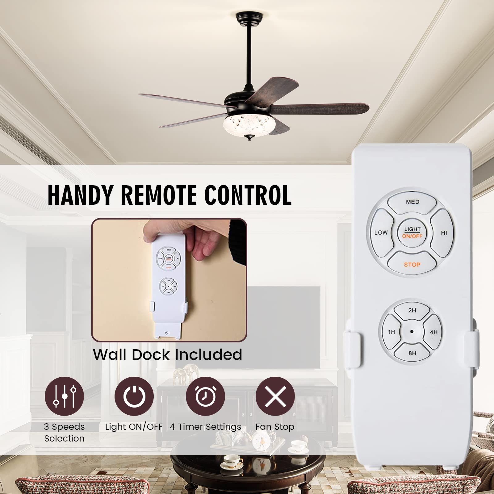 • [Handy Remote Control]: There are multiple buttons for 3 wind speeds selection (low/medium/high), light ON/OFF, fan stop, and 4 hours time setting (1 hour/2 hours/4 hours/8 hours). All of these buttons make the operation easier. And the wall dock is included, which brings a perfect storage space for the remote control. Required for 2 x AAA batteries (not included).