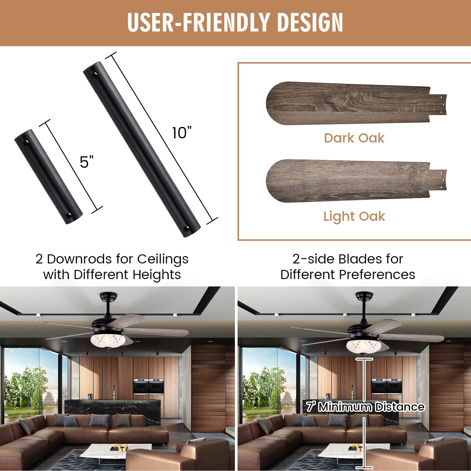 • [Mounting Options]: This quality ceiling fan offers 2 mounting options. Based on the different types of ceilings, this ceiling fan can be hung downrod or angled. And the 2 downrods (5"/10") are included which makes this ceiling fan suitable for ceilings of different heights.