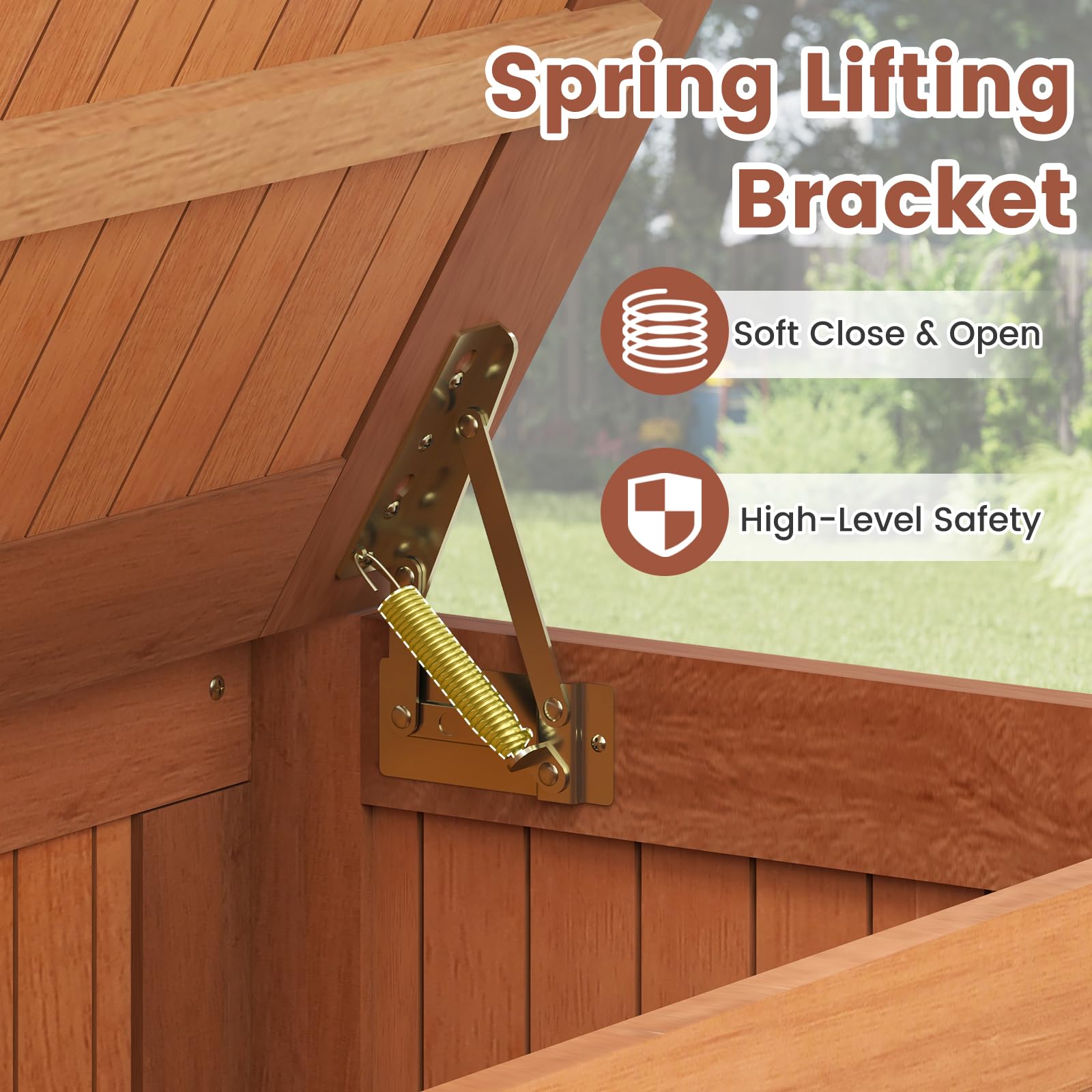 With 3-in-1 versatile design, the storage box also function as an additional seat or a patio coffee table. The robust solid wood frame with teak oil finish promises longevity of the storage stool. Moreover, the lid with spring-lifting brackets ensures safe and easy use. Make outdoor organization a breeze and add a touch of natural aesthetics with this versatile wood deck box.