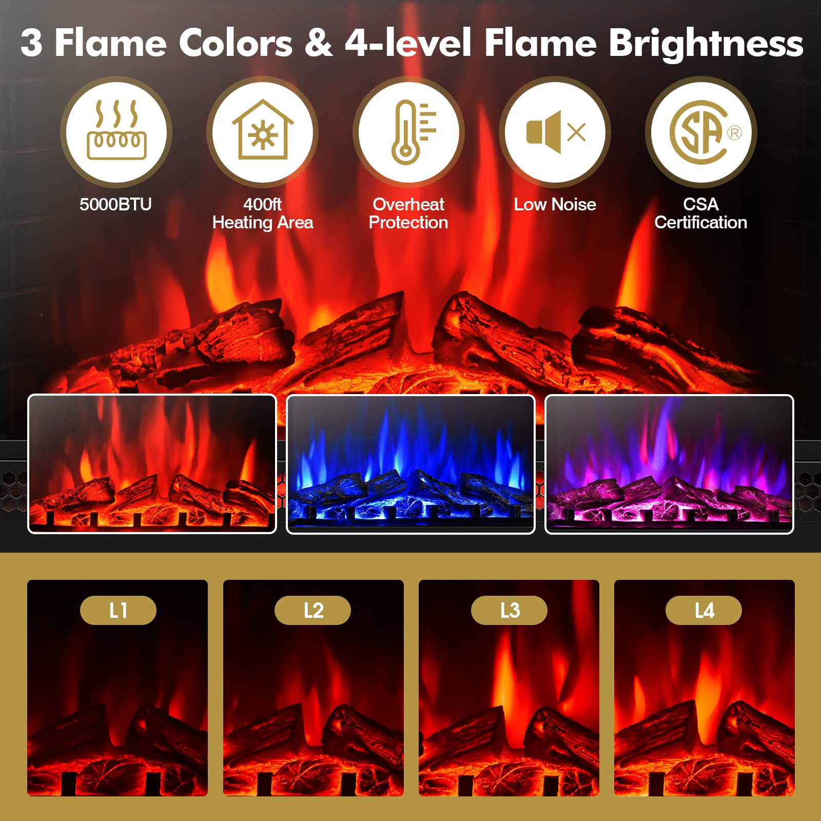 - Realistic Flame Effect & Dual Control: The electric fireplace features 3 flame colors and 4 flame brightness settings that can be used separately with or without heat based on your needs. Besides, the heater is designed with overheat protection for safety use. The remote control and control panel allow you to operate the electric fireplace with great convenience.