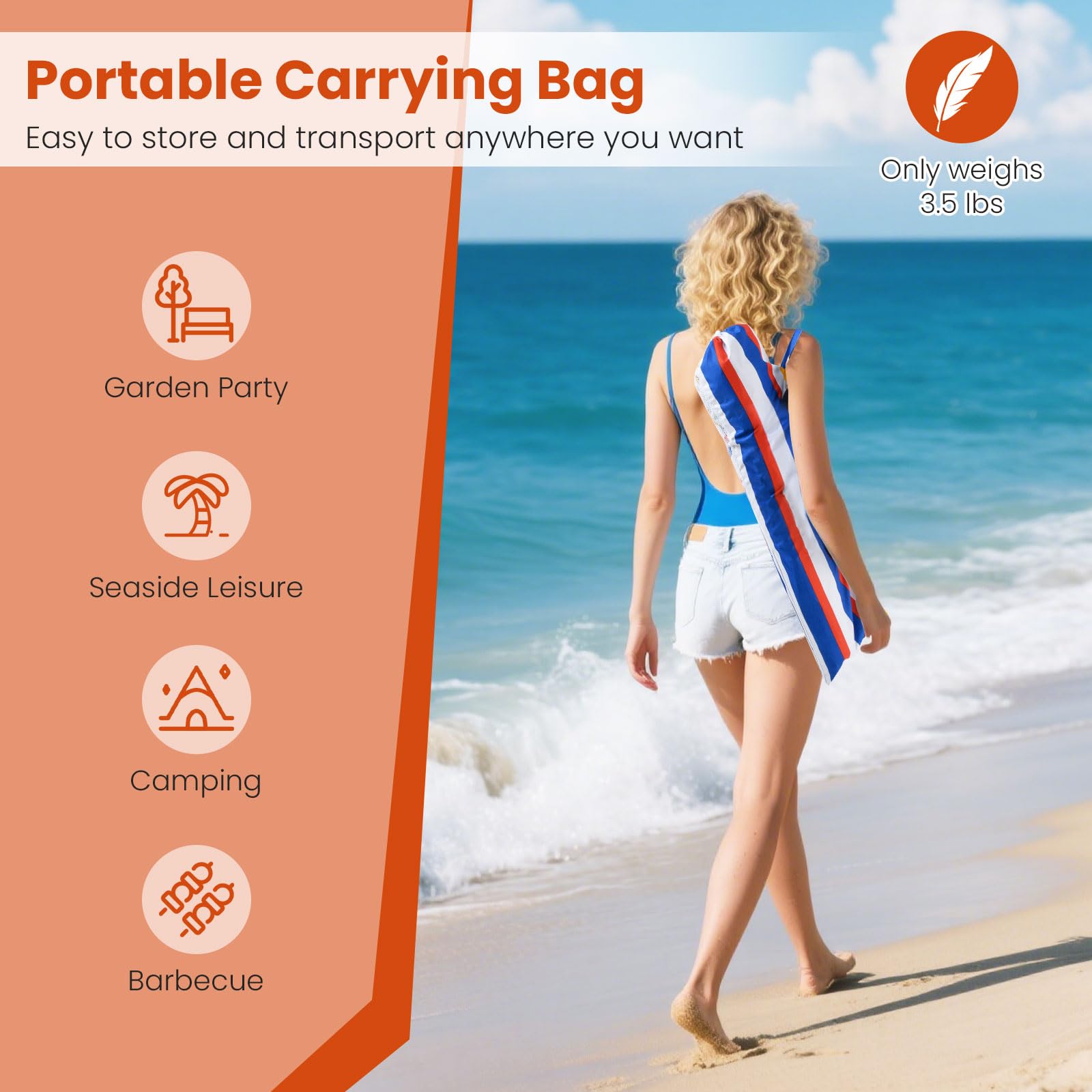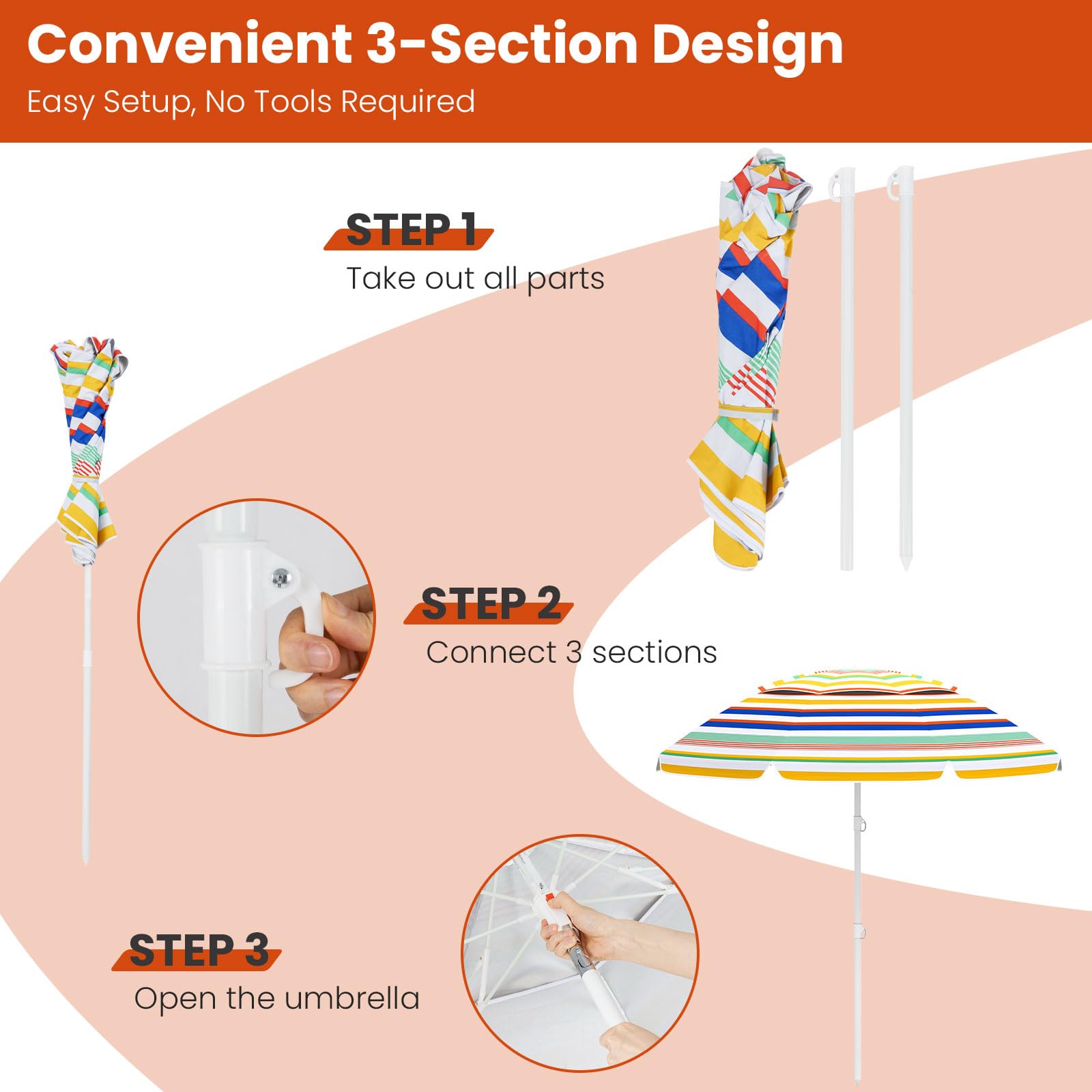 Our 6.5 ft/200 cm beach umbrella boasts a high-quality polyester canopy with silver coating, providing you with UPF50+ sun protection to safeguard against harmful sunlight. Its ease of use is highlighted by a tool-free setup and a lightweight design, making it perfect for quick outings. Weighing just 3.5 lbs, it includes a handy carrying bag for seamless transport and storage. Adjust the canopy with a simple push of a button to enjoy customizable shade, designed to block the sun from different directions throughout the day. For enhanced stability, the umbrella includes an air vent at the top and a sand anchor that makes it easy to secure in the sand. Whether you're relaxing on the beach, in your garden, or at a picnic, this beach umbrella is your ideal companion for any outdoor setting!