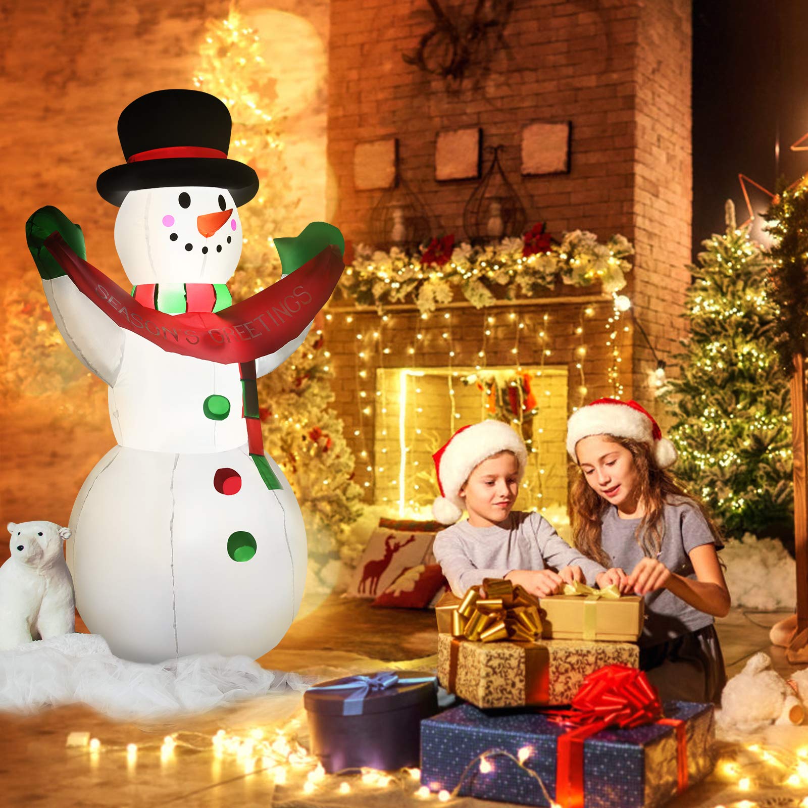 Our inflatable snowman has a lovely design with a top hat and scarf, which is perfect for Christmas indoor and outdoor decorations. In addition, the banner on its hand can leave a good impression on the guests! Its internal LED bulbs will give you a better view, which is perfect for your nighttime display. Just plug in the adapter and it will automatically inflate. If you are worried that it will be easy to shake, use ropes and ground stakes to secure it to the ground.