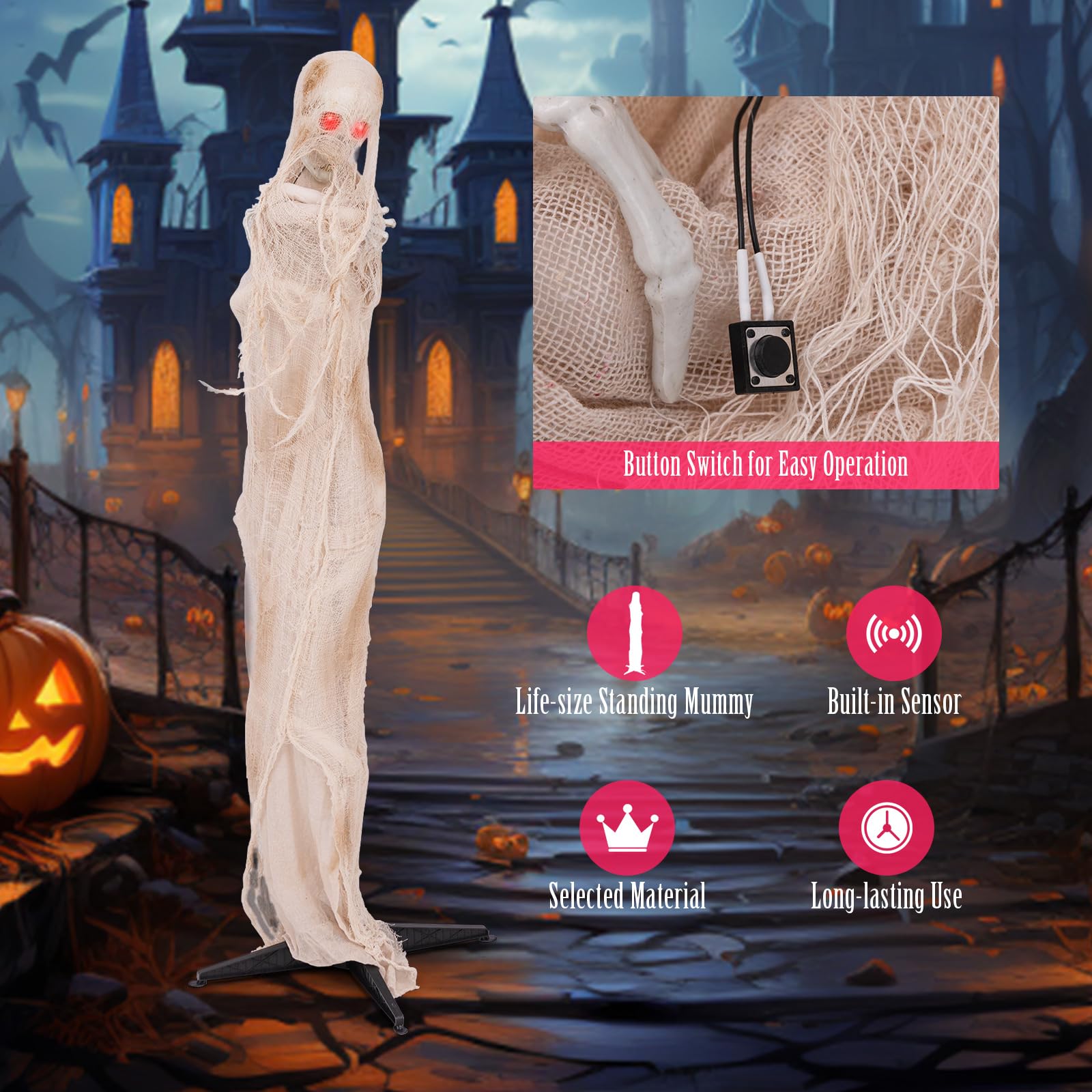 - Scary Holiday Decoration: Bring the eerie charm of ancient Egypt to your Halloween decoration with this 6ft animated mummy. Designed with striking LED red glowing eyes, this animatronic mummy casts a fearsome glow that enhances spooky Halloween ambiance.