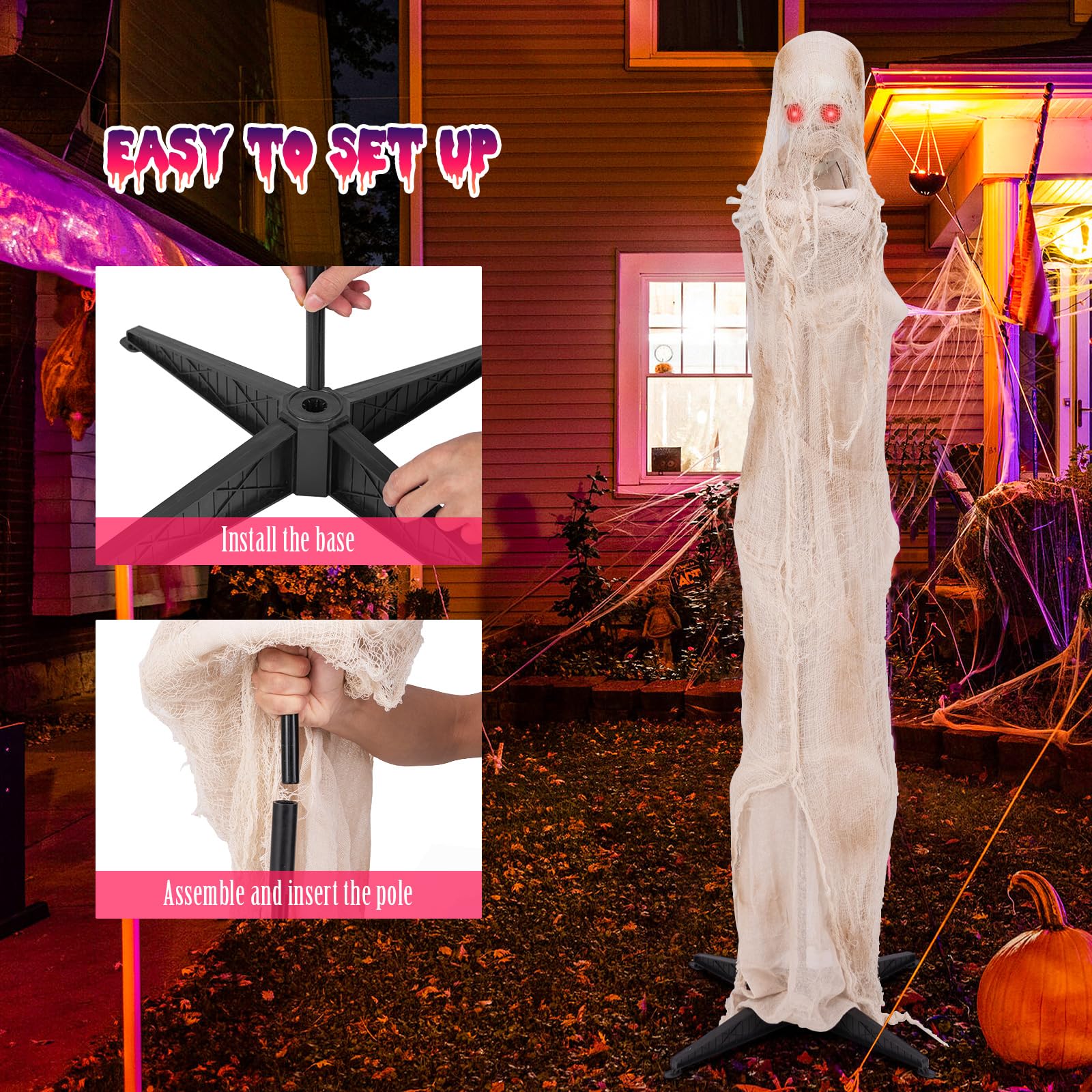 - Easy to Set up: Operated by batteries, this prop offers the convenience of easy setup without the hassle of cords. How to use the standing mummy? What you need to do is install the base, then assemble and insert the pole.