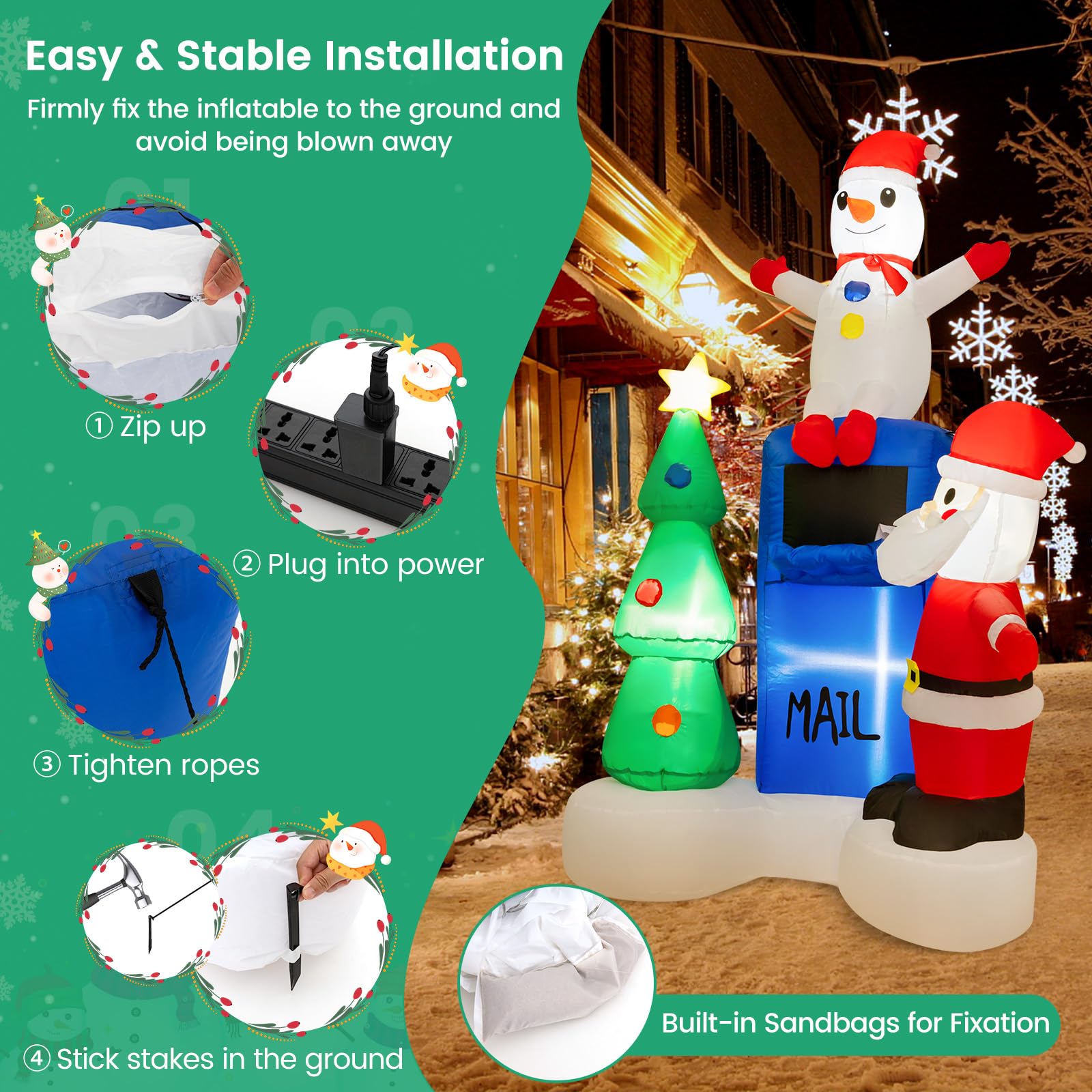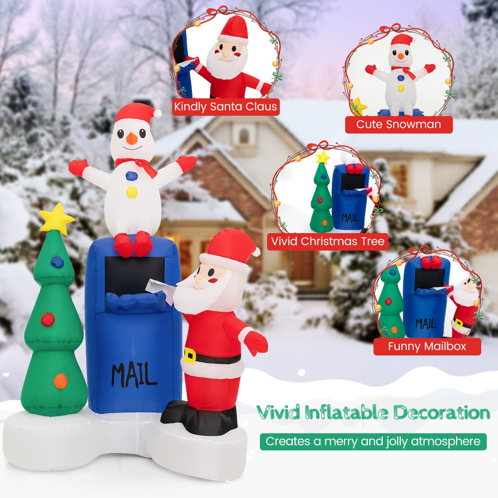 • Eye-Catching Christmas Decoration: The 6 ft vivid inflatable decoration features a kindly Santa Claus, a cute snowman, a vivid Christmas tree, and a funny mailbox, creating a merry and jolly atmosphere. Also, it will instantly grab the attention of anyone passing by.