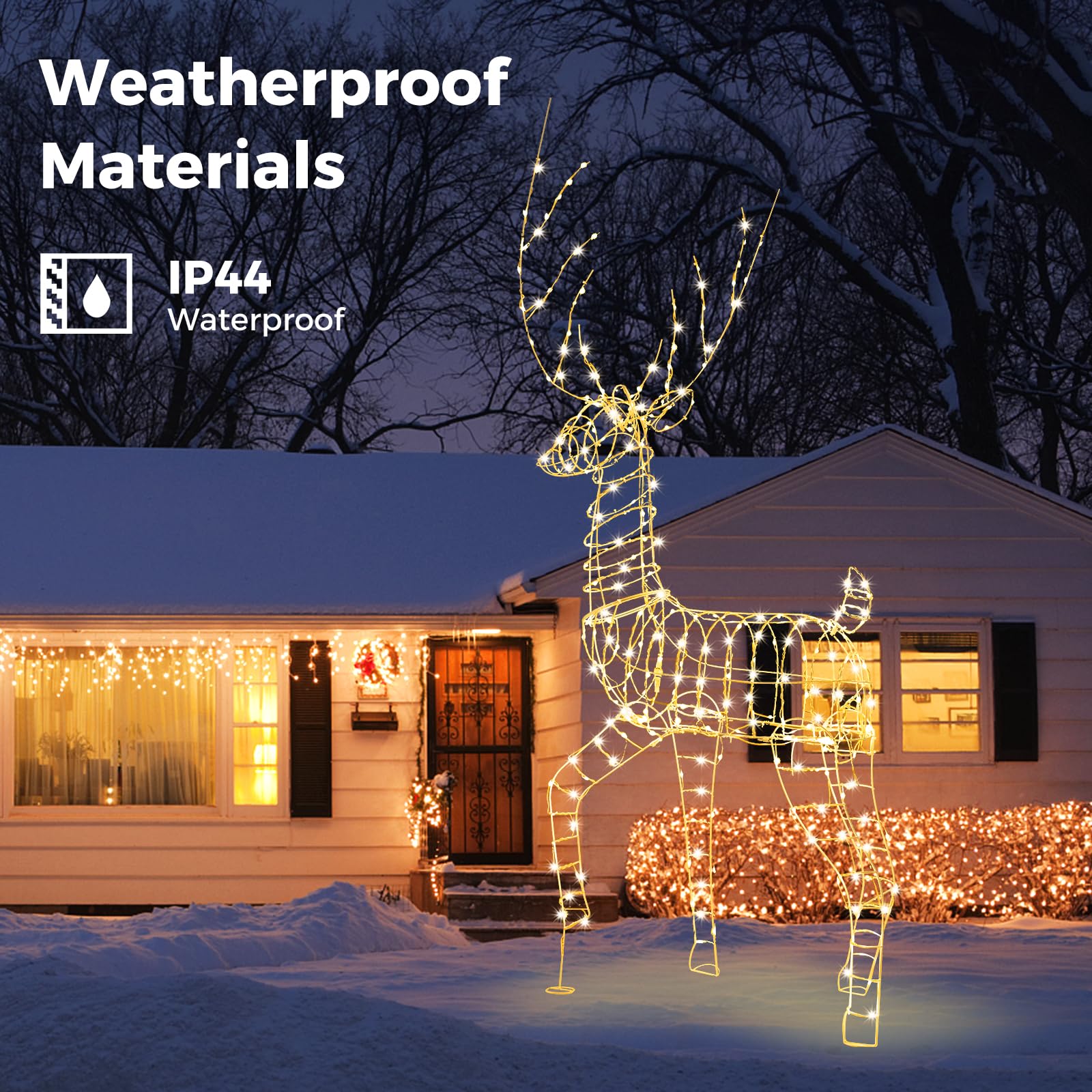 - All-Weather Construction: Crafted with IP44 waterproof and weatherproof materials, the pre-lit Christmas reindeer is designed for durability. The rustproof metal frame ensures long-lasting use and stability in the outdoor environments.