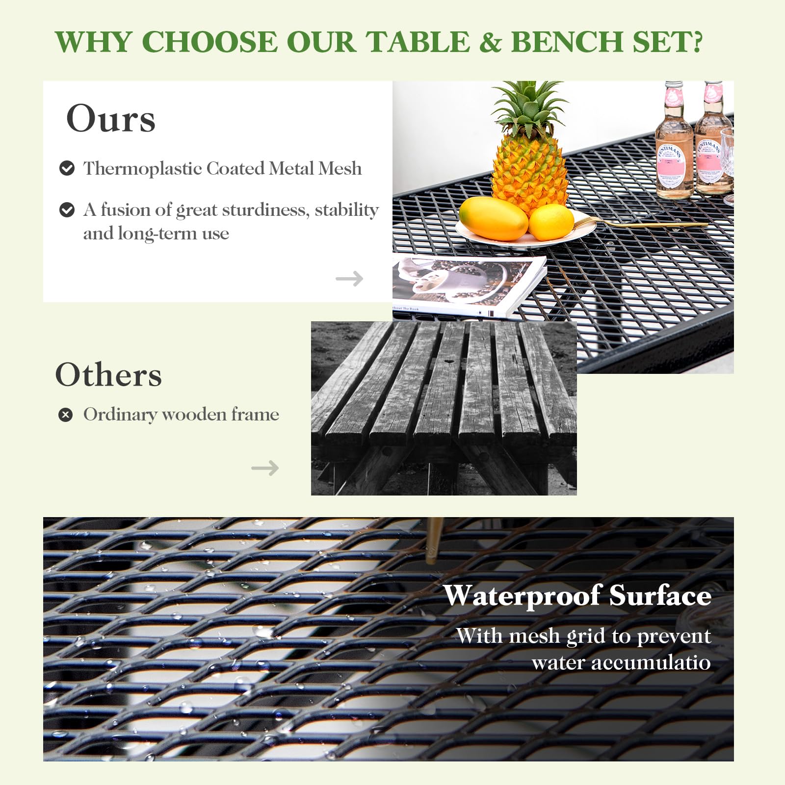 Elevate your outdoor gatherings with this picnic table and bench set, which is designed to comfortably seat up to 8 people. Accompanying benches provide ample seating, making it an excellent choice for family gatherings, barbecues, or outdoor parties. Moreover, the well-constructed benches and table ensure stability and sturdiness, preventing wobbling or tipping. The top surface includes a mesh grid design that enhances its visual appeal and allows for quick drying. The picnic table set is an invaluable addition to any area intended for gatherings, family meals or commercial event, combining functionality with style.