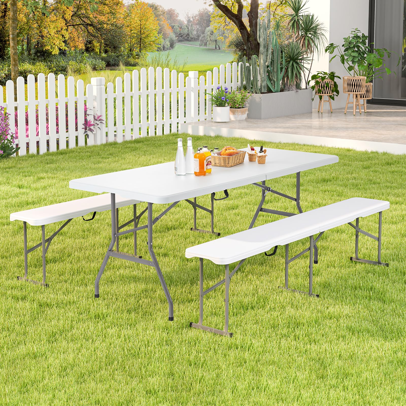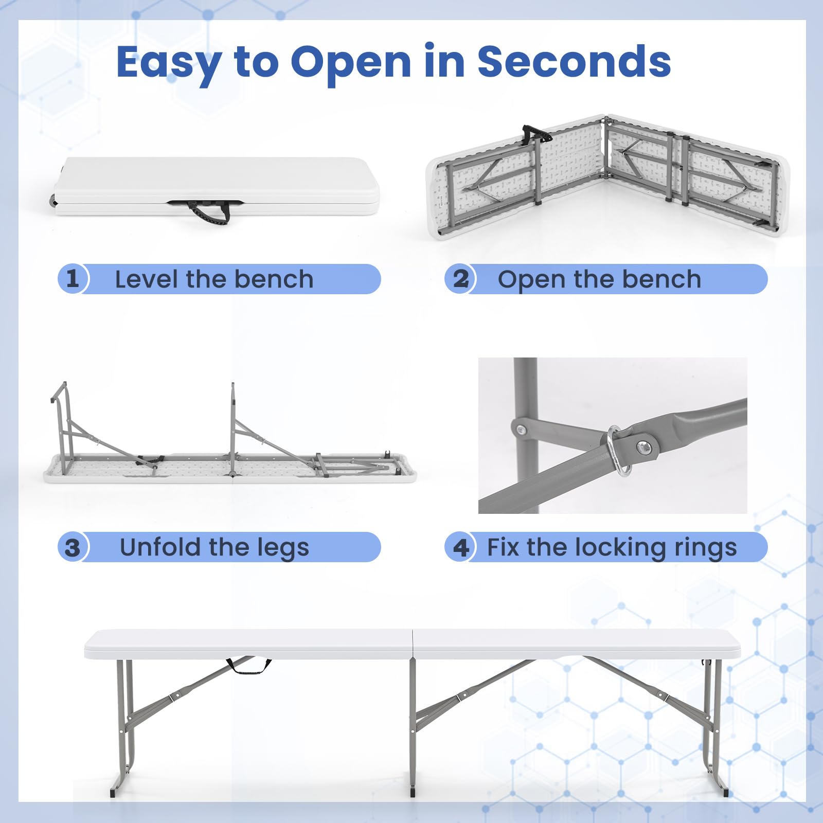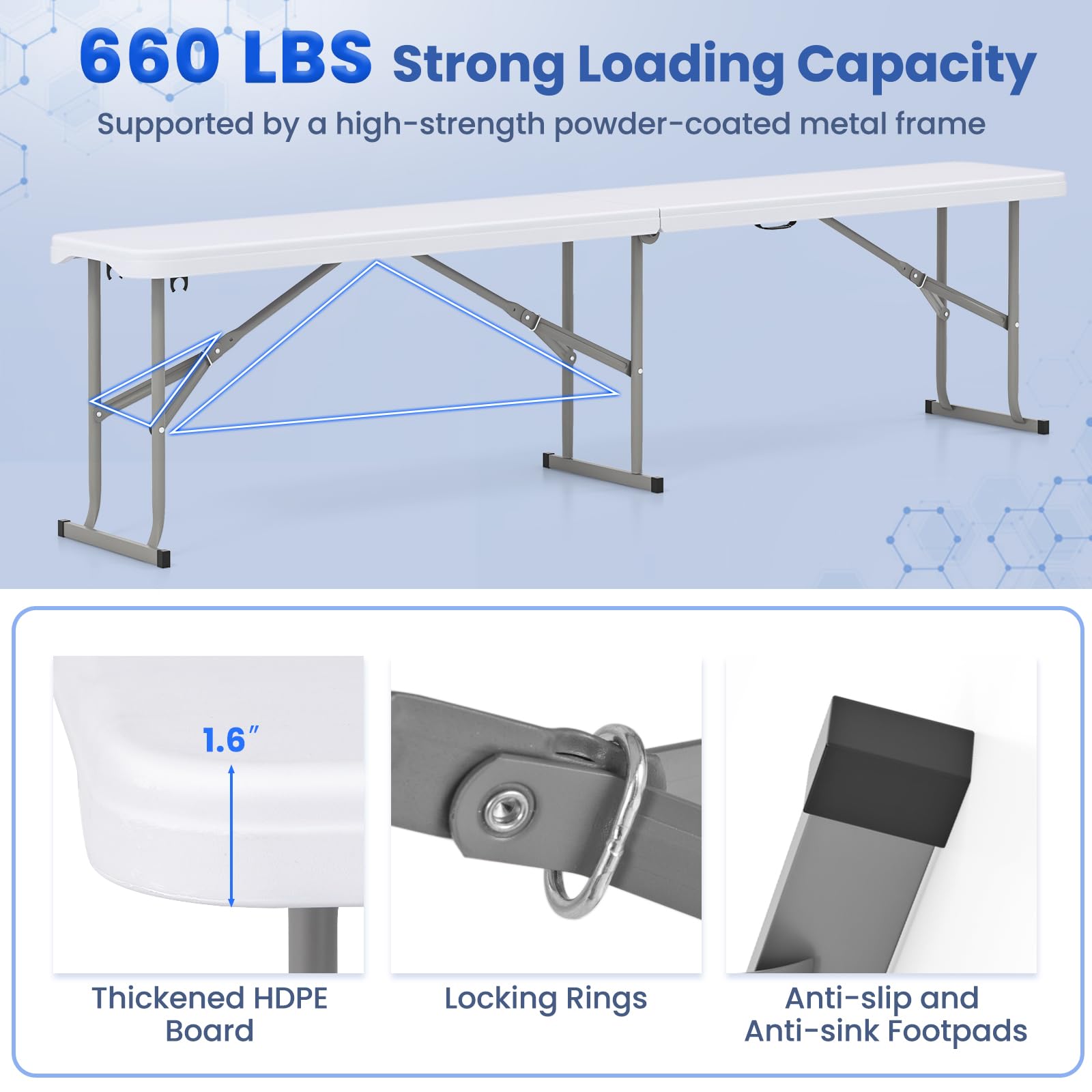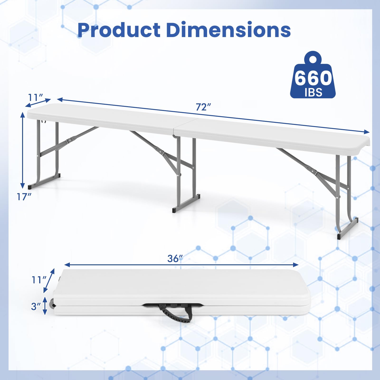 This folding bench measures 72” x 11” x 17”(L x W x H) and loads up to 660 lbs, which could comfortably accommodate 3 people, providing additional seating for various outdoor and indoor activities. It is ideal for dining, picnics, barbecues, parties, sports events, camping trips, and more. When not in use, just fold it in half, and there is a handle on the side, making the bench easy to carry and transport for on-the-go use. Other than that, it adopts a weatherproof and crack-resistant HDPE seat, ensuring superior strength and durability. And the heavy-duty powder-coated metal frame enhances overall sturdiness and stability, providing robust support for every activity.