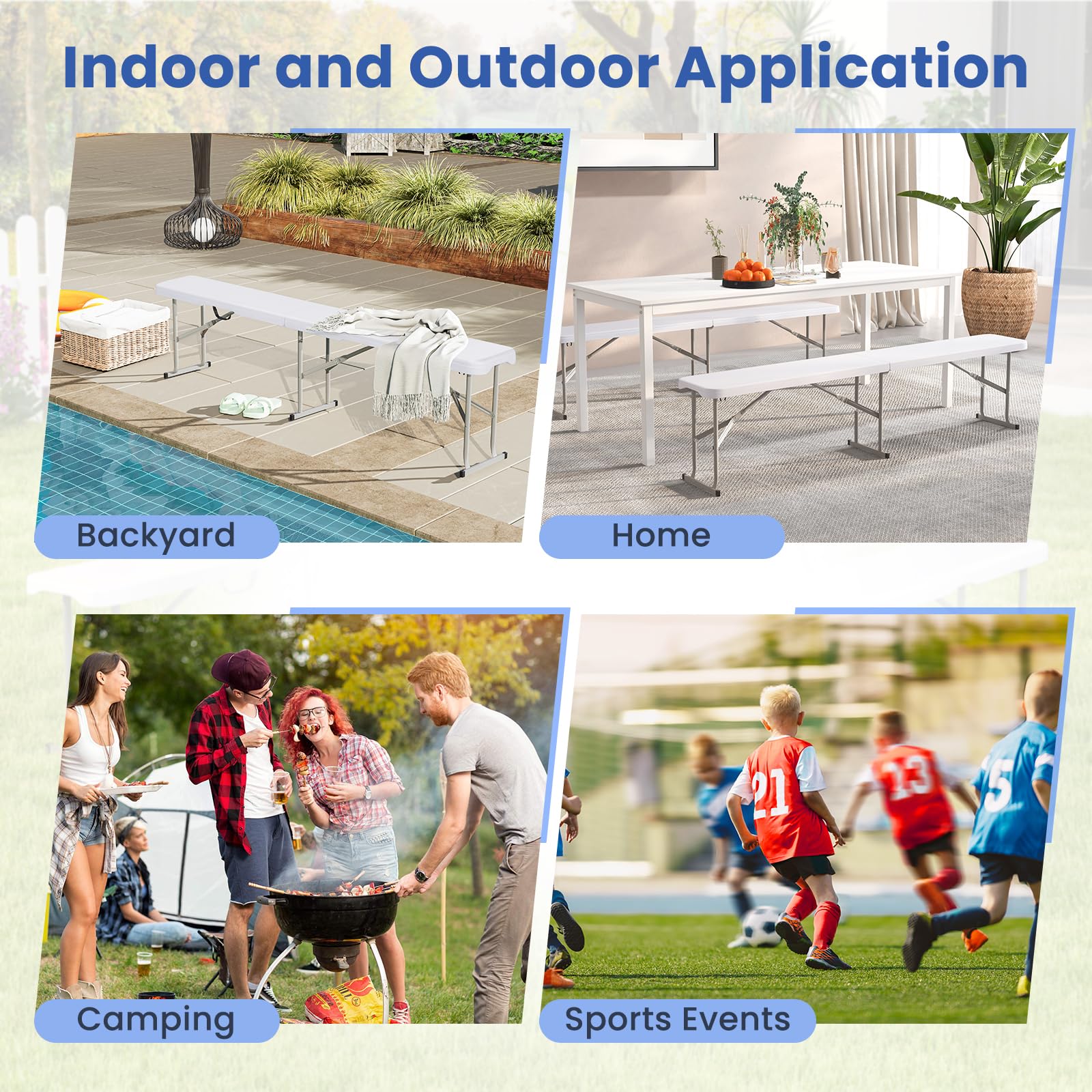 • Indoor and Outdoor Application: Whether at home or on the go, this foldable bench can be a perfect choice for various indoor and outdoor activities, such as dining, picnics, backyard barbecues, camping trips, tailgating events, weddings, sports events, and more.