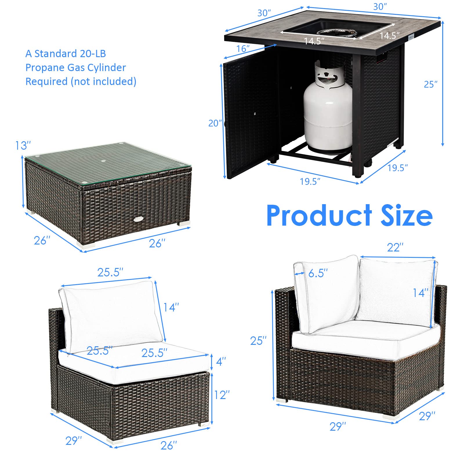 - Multiple Combining Ways: This patio set includes 1 fire table, 1 coffee table, 2 corner sofas, and 2 armless sofas. You can arrange the 6 pieces as you like to fit the size of your backyard. The coffee table with tempered glass top allows you to easily fetch items you want. Also, the fire pit table comes with a dustproof cover, which gives considerable protection when not in use.