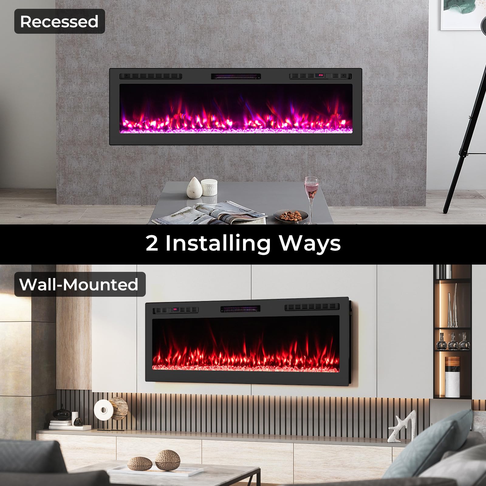 This versatile fireplace heater offers 2 installation options: sleek wall-mounted or seamlessly recessed to fit your decoration. Tailor your atmosphere with 12 flame and ember bed colors, adjustable across 5 brightness and speed settings. Additionally, you can enjoy these effects with or without heat all year round. This smart fireplace allows you to control all features effortlessly via remote, smartphone app or the built-in panel. Adjust the 750W/1500W heat settings, set 1H-12H timer and more from the comfort of your couch. Safety is paramount with ETL certification and built-in overheat protection, ensuring peace of mind as you bask in the cozy glow of your new fireplace heater.