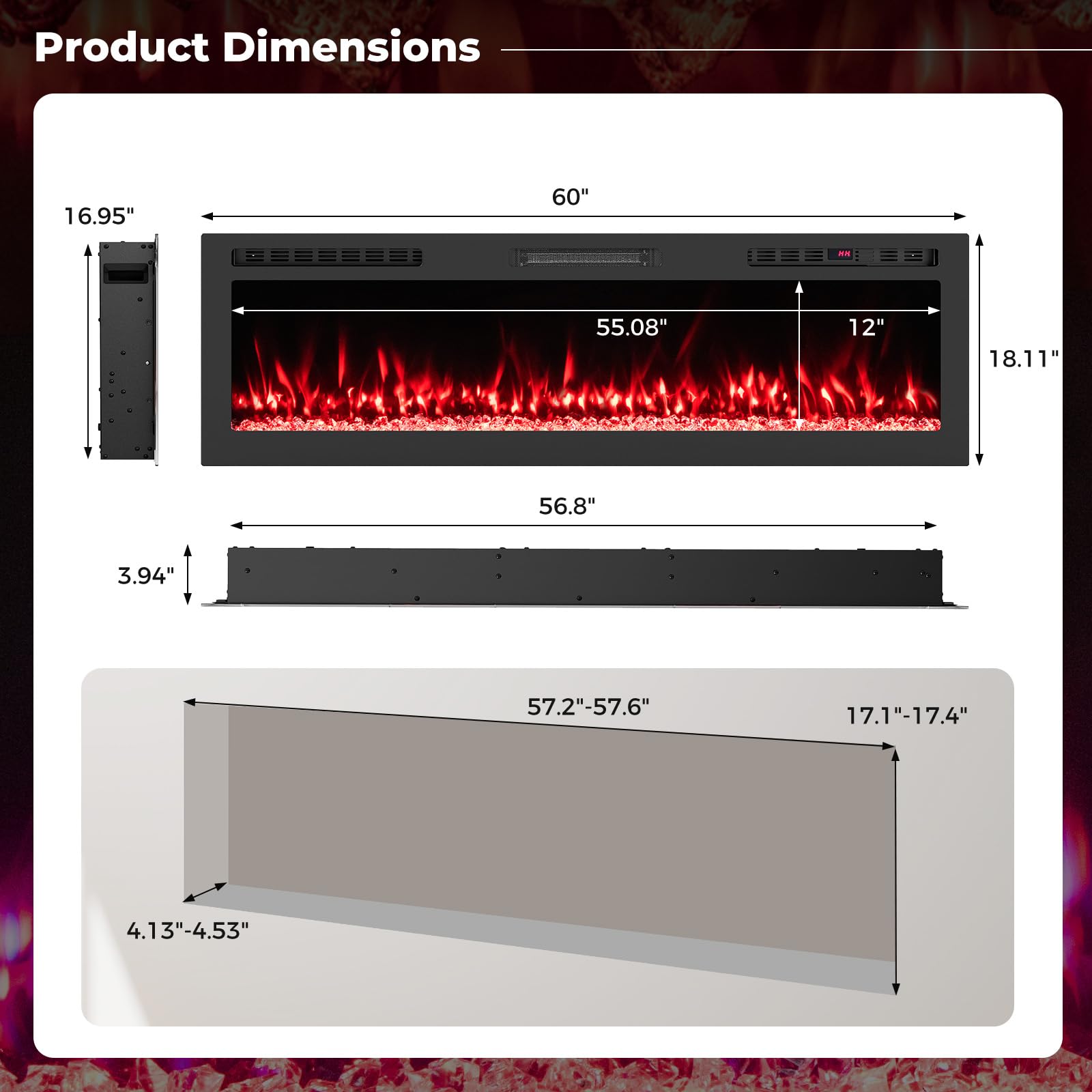 Recommended Recessed Dimensions: 57.2”-57.6” x 4.13”-4.53” x 17.1”-17.4”/145.3-146.3 x 10.5-11.5 x 43.5-44.2 cm (W x D x H)