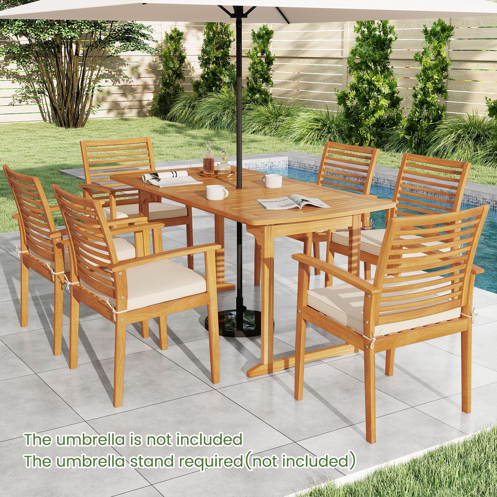 Measuring 63" x 32" x 30"/160 cm x 80 cm x 75 cm (L x W x H), the 4-6 large dining table enables you to host guests comfortably for outdoor meals and celebrations. The durability of the acacia wood ensures that the table can withstand regular use without losing its appeal. More than that, there is an umbrella hole that allows you to hold your umbrella(the umbrella is not included), thus enjoying a pleasant outdoor dining experience. Additionally, the support legs of the wood dining table feature a solid rectangular frame for enhanced stability.