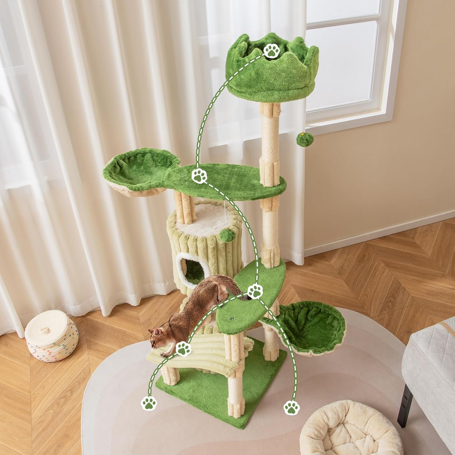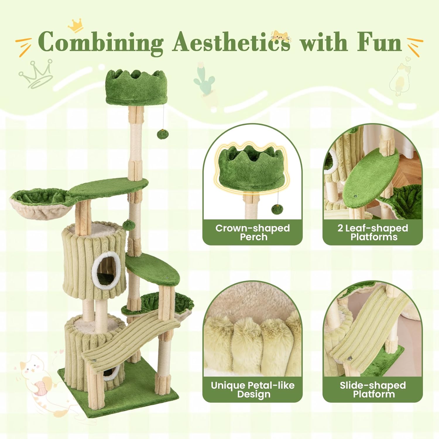 - Combining Aesthetics with Fun: Featuring a harmonious combination of green leaf-shaped platforms and petal-like condos, the indoor cat furniture evokes the serenity of natural landscapes. Additionally, there exists a platform to mimic the slide in an amusement park to add extra fun.