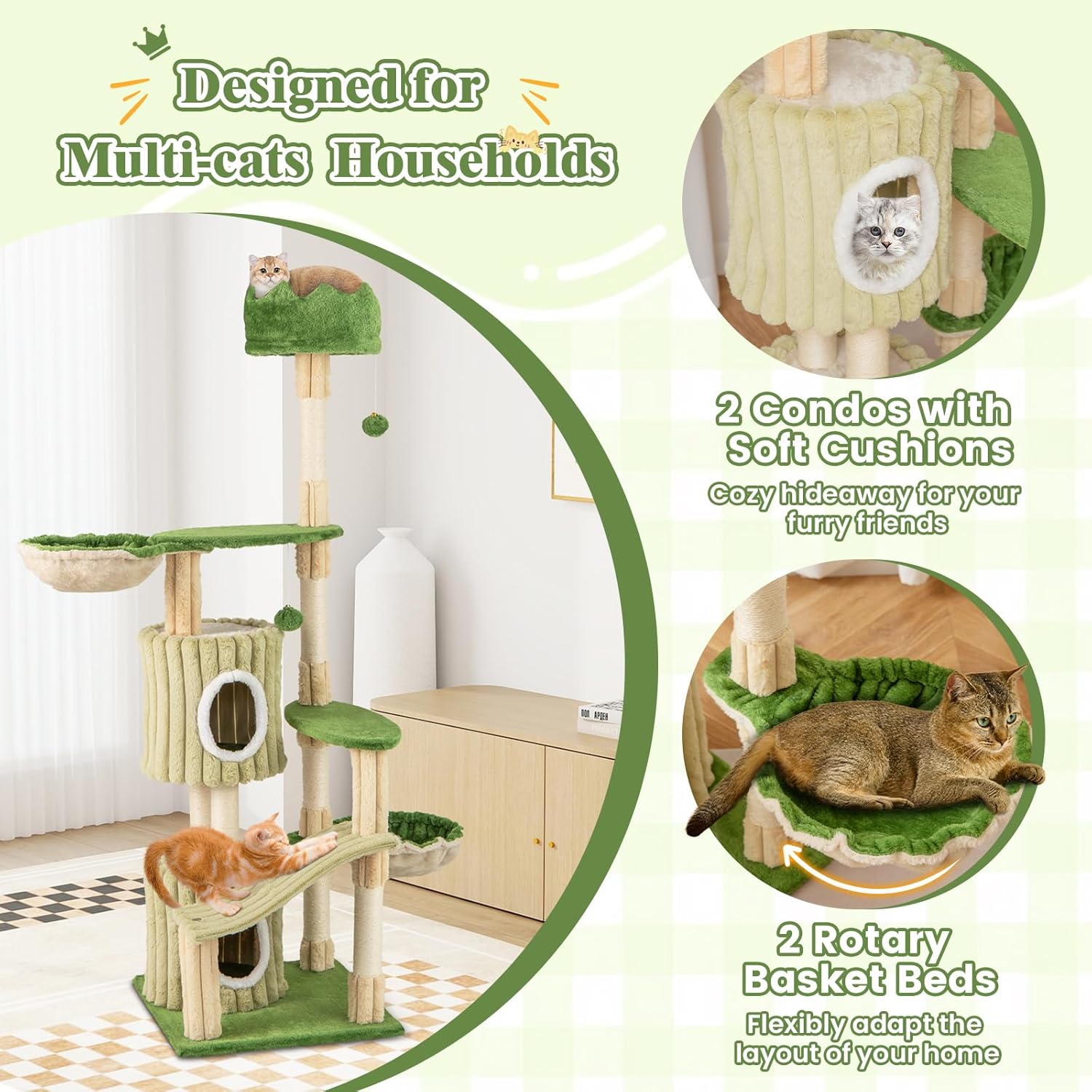 The ultra comfortable padded perch offers an amazing vantage point for cats to survey the surroundings and feel like the king of the castle. Equipped with dual spacious condos and 2 rotatable basket beds, the versatile kitty tree is designed for multi-cats households. The addition of hanging toys and scratching posts keeps cats entertained, while protecting your furniture from sharp claws. Plus, the multiple levels provide endless entertainment and opportunities for climbing and exploring. Featuring 2 leaf-shaped platforms, a slide-shaped platform, 2 condos with petal-like wall, the tall cat tower is an aesthetically pleasing playground for your kittens. Equipped with an anti-toppling device, this cat furniture ensures stability and prevents any wobbling or tipping over when your cats climb up and down. The whole cat tree is covered with soft plush to spoil your furry friends with a touch of luxury!