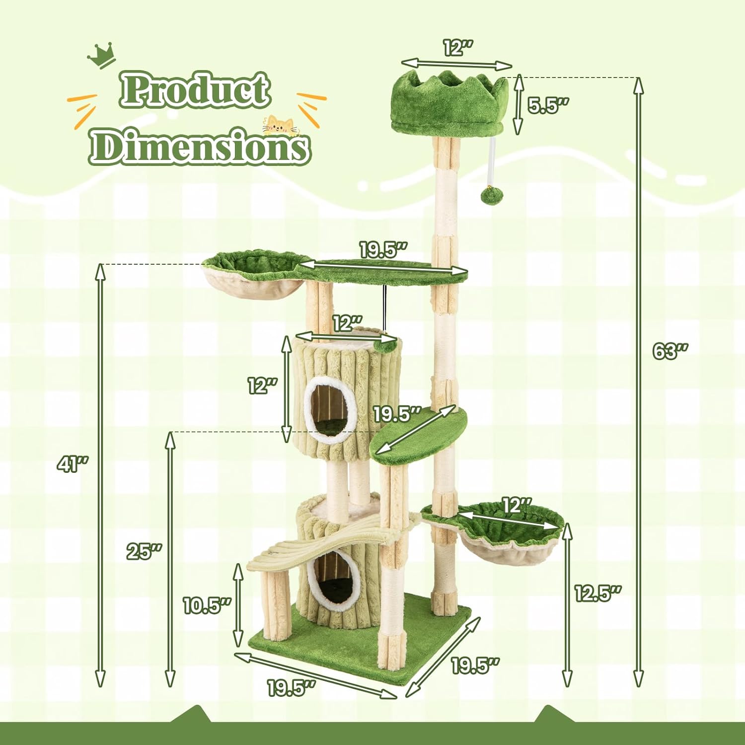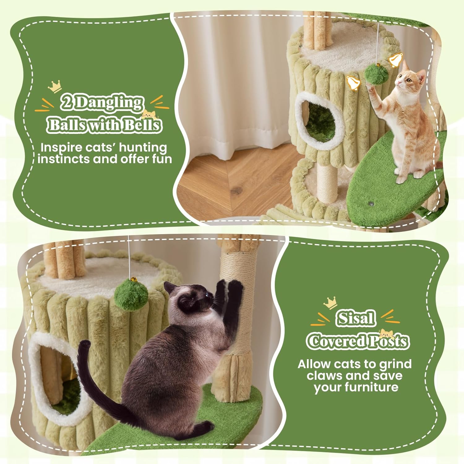 - Satisfy Felines’ Natural Instincts: The cat tree comes with sisal wrapped scratching posts to distract your felines’ attention from furniture and promote healthy scratching behavior. Moreover, the plush dangling balls with bells will provide them with mental and physical stimulation.