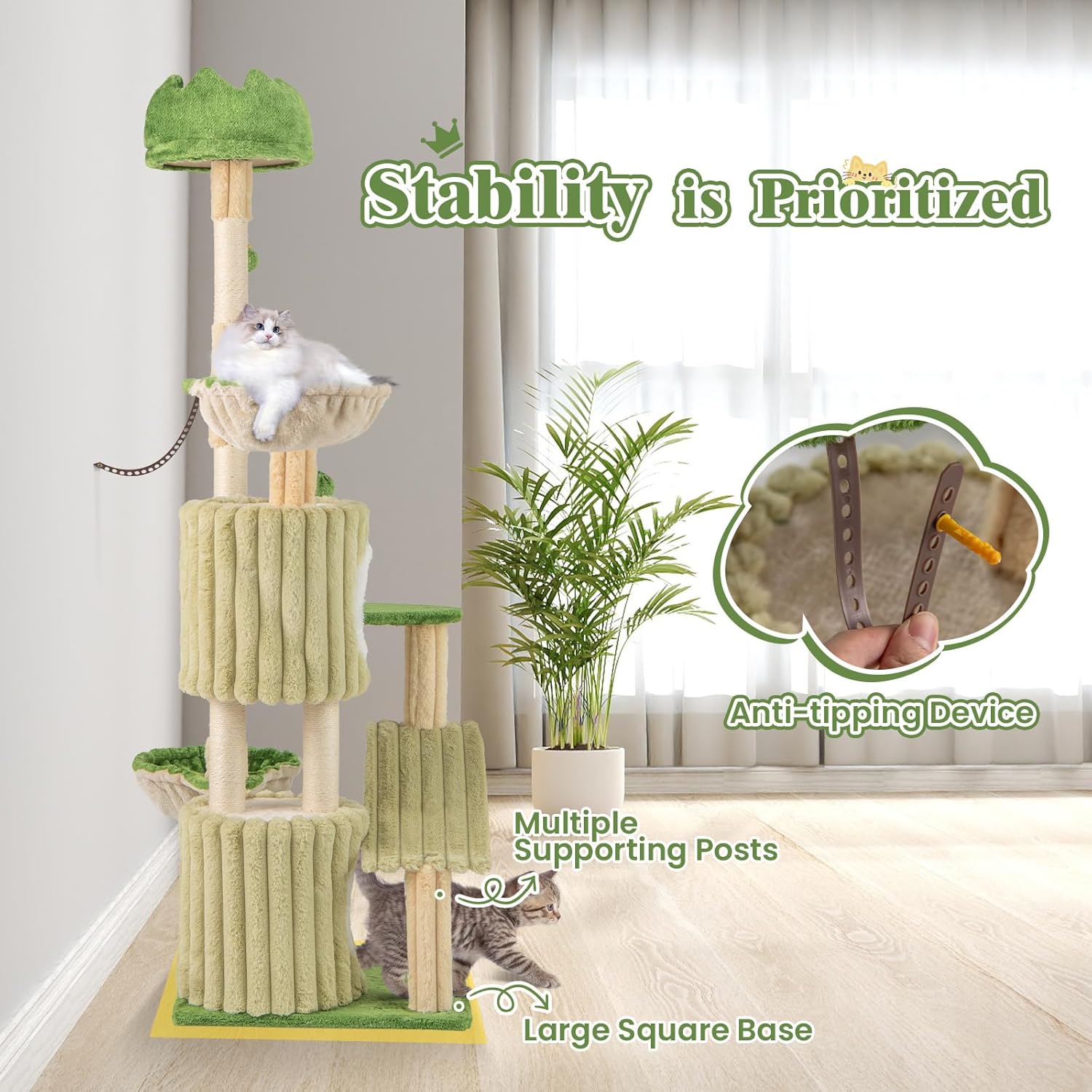 - Stability is Prioritized: Equipped with an anti-toppling device to securely anchor the tall cat activity center to the wall, there is no worry about accidental tipping over. In addition, multiple supporting posts and a wide base allows your feline companions to climb and play in a secure environment.