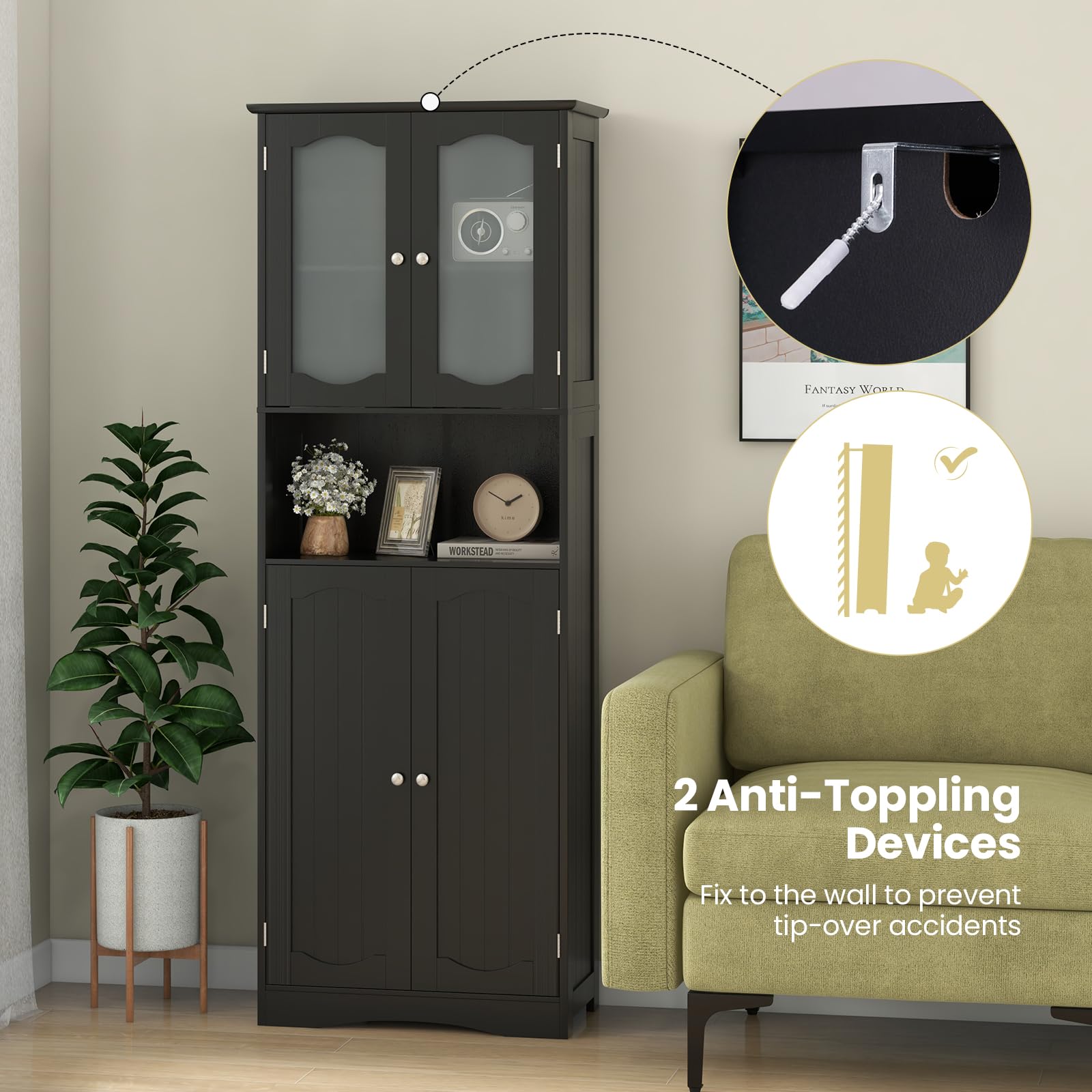 Featuring 2 tempered frost glass doors, this pantry cabinet will add elegance and privacy to your space. The 2 adjustable shelves offer versatile storage options for toiletries and towels. An open storage compartment provides easy access to frequently used items, promoting efficiency and organization. The package includes anti-toppling devices for added safety, making it suitable for homes with pets. The stylish and modern design seamlessly blends with various interior styles, making it a versatile addition to any room in your home.