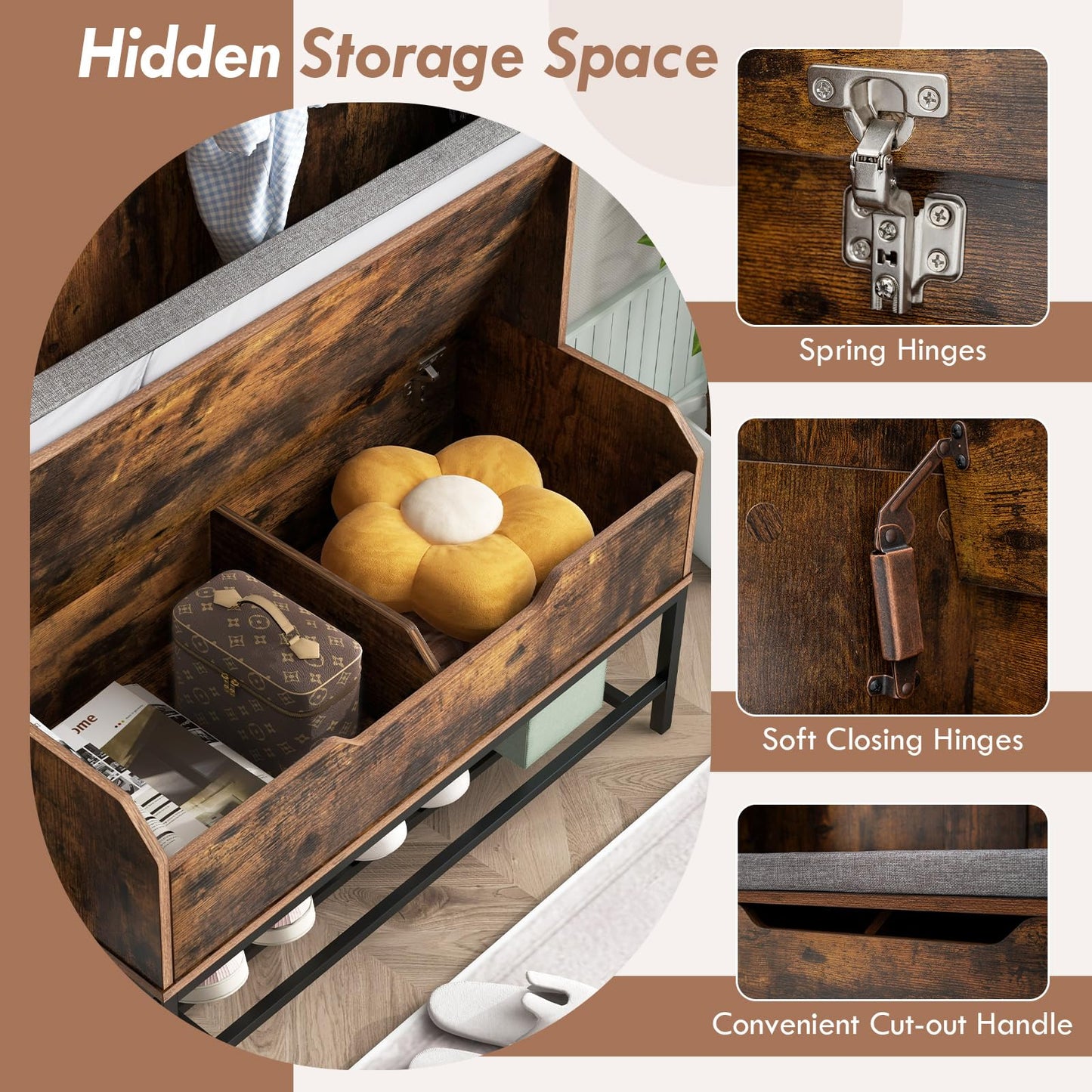 - Hidden Storage Space: Designed with a hidden storage compartment under the seat, the 4-in-1 entryway bench helps tuck away items out of sight. The lift-up seat board makes items easily accessible, thanks to its convenient cut-out handle, spring hinges and soft closing hinges.