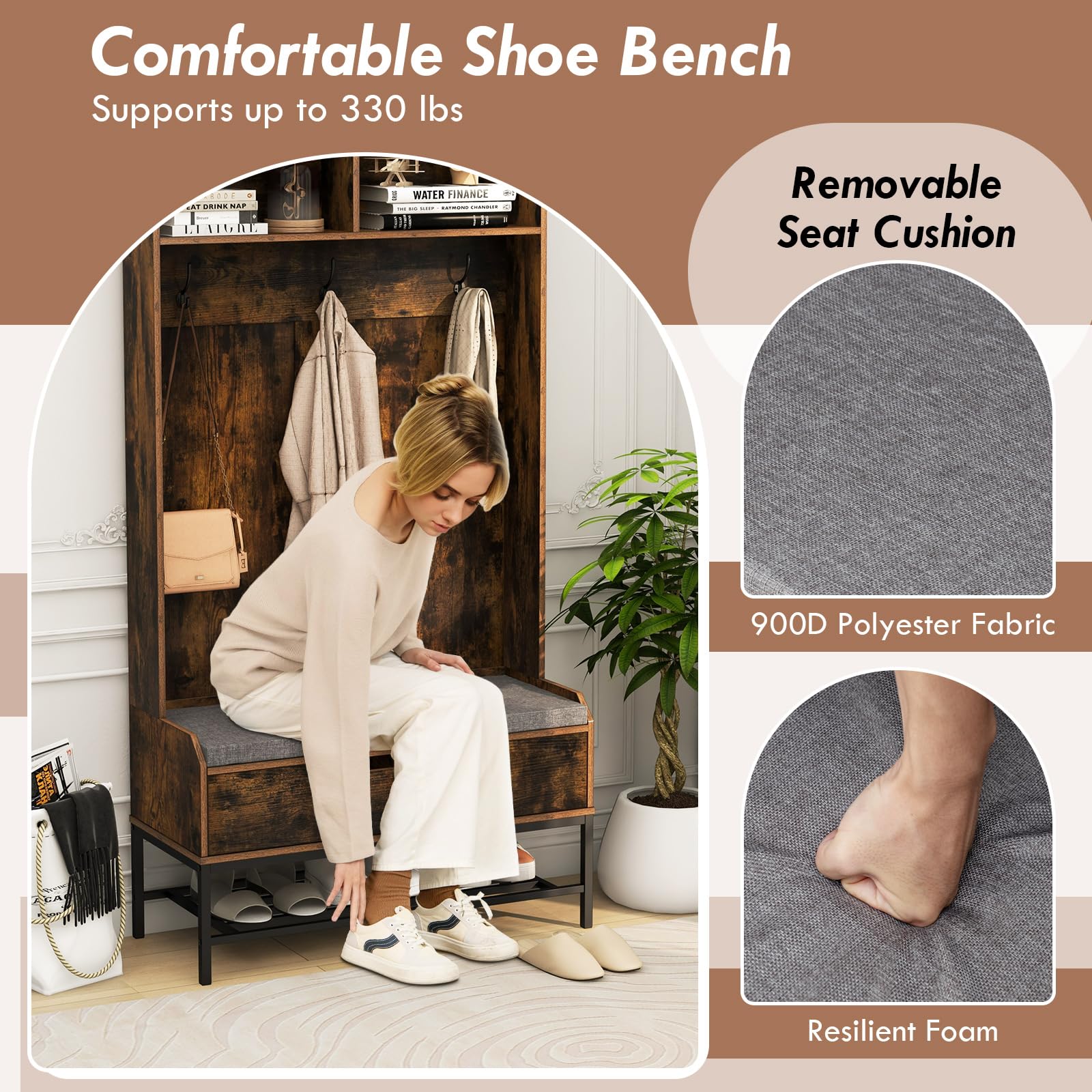 - Removable Seat Cushion: The 4-in-1 coat rack boasts a seat cushion covered by 900D polyester fabric and filled with resilient foam, ensuring enduring comfort while you are putting on or taking off your shoes. The shoe bench has a weight capacity of up to 330 lbs, providing sturdy support.
