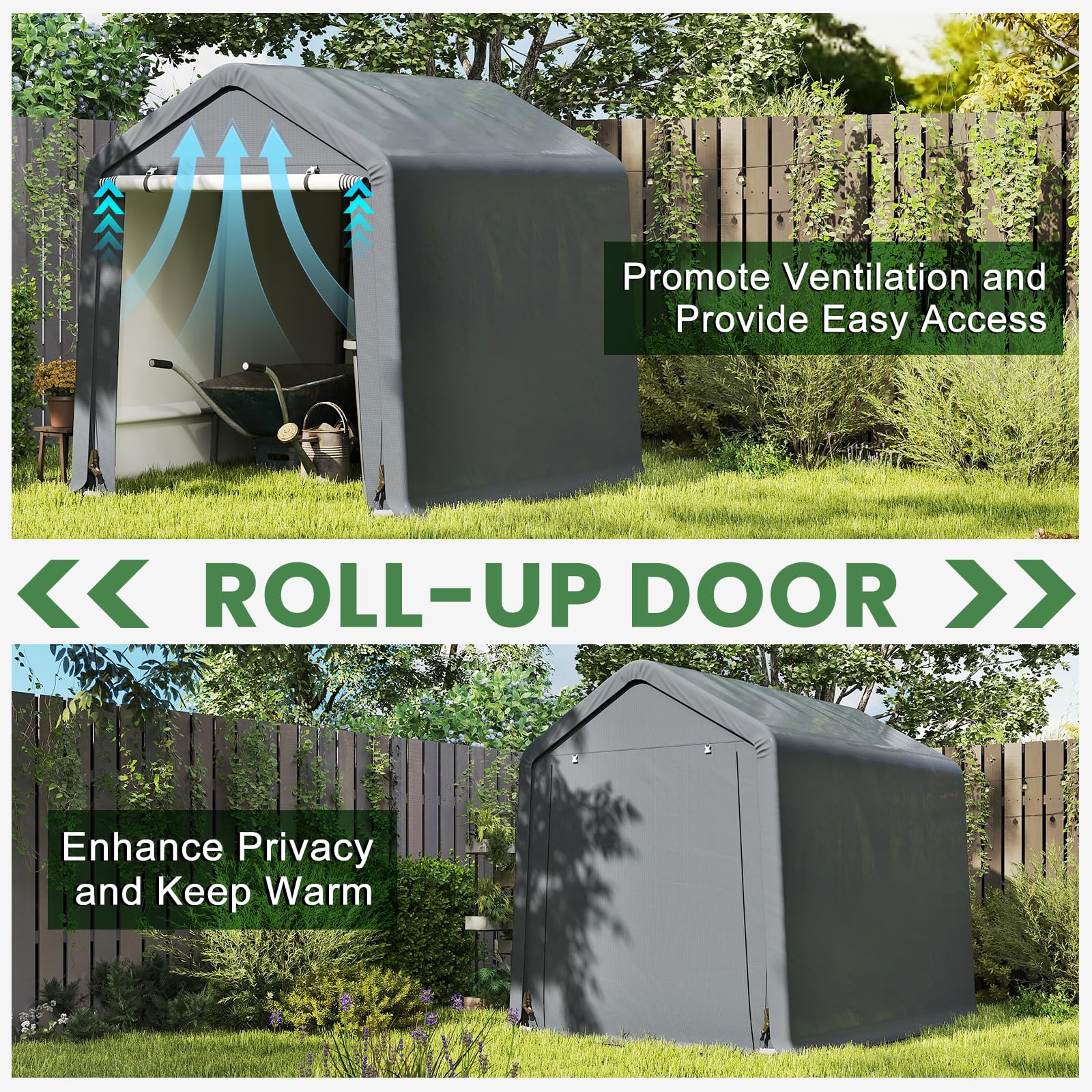 - Large Space & Roll-up Door: Measuring 6.5 ft x 6 ft x 7 ft/6.5 ft x 8 ft x 7 ft (L x W x H), the portable garage shelter offers ample space for storage. The roll-up zipper door not only facilitates easy access but also promotes air circulation. Once the door is closed, the portable tool shelter can enhance privacy.